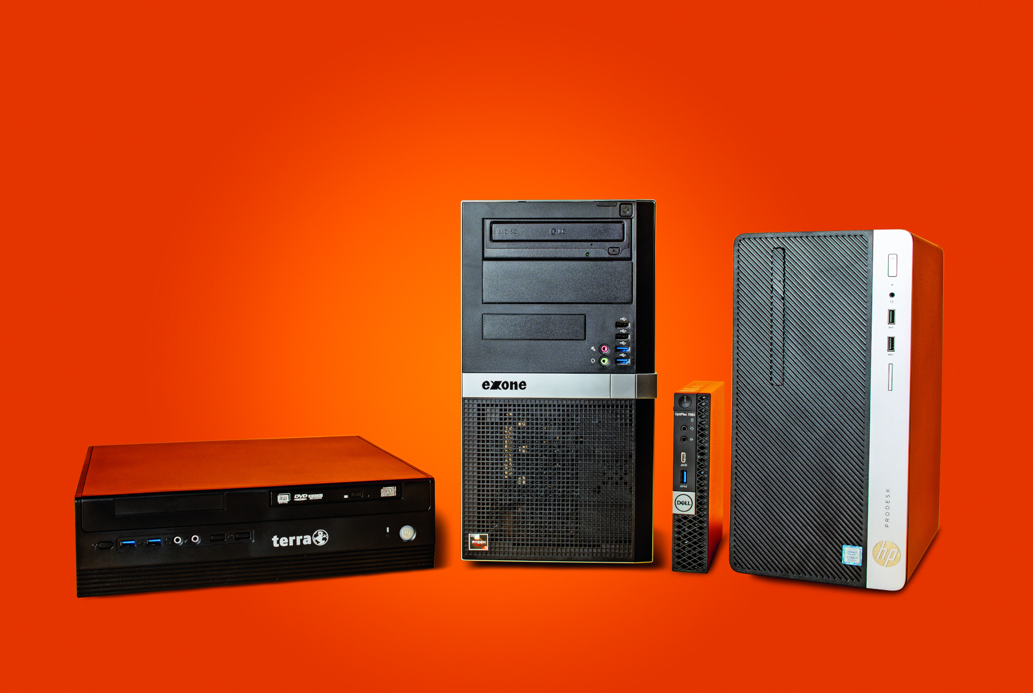 Unsere Wunschkandidaten für diesen Test sollten Prozessoren aus den aktuellen Modellreihen Core i-8000 oder Ryzen 2000G, eine SSD sowie mindestens 8 GByte Speicher haben. Vier Bürorechner von Dell, Extra Computer, HP und Wortmann im Bereich von 680 bis 910 Euro stellten sich den Anforderungen: OptiPlex Micro 7060, Exone Business 1303, ProDesk 400 G5 und Terra Business PC 6000. Zwei Mal internationaler Großkonzern und zwei Mal deutscher Mittelstand also.