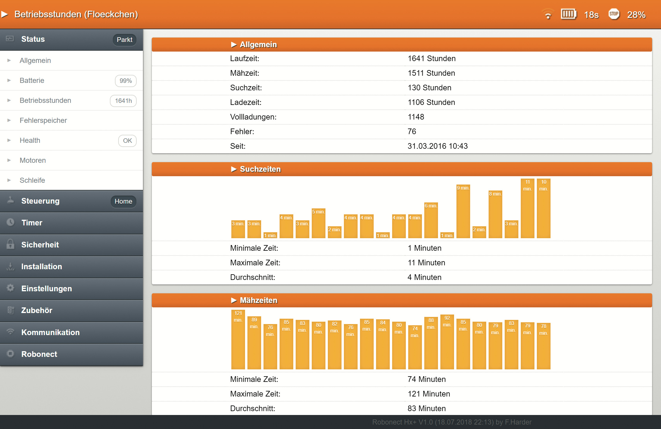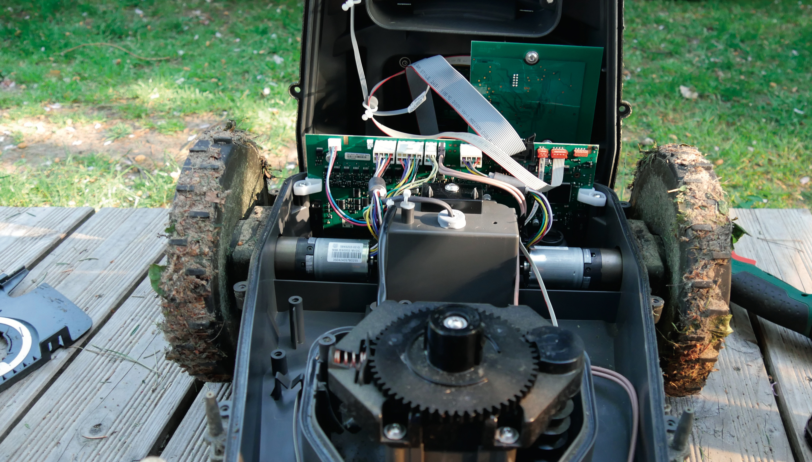 Die Diagnoseinformationen, die der Mäher übers Web-Interface preisgibt, lassen kaum Wünsche offen: Livedaten zur Motorleistung auf den zwei Lenkachsen, ausführliche Informationen zur Akkukapazität und den Be- und Entladezyklen, Laufzeit seit dem letzten Messerwechsel oder eine Statistik zur Dauer der Suche nach dem Rückführungsdraht für die Heimfahrt zur Ladestation. Auf der Platine steckt zudem ein zusätzlicher Temperatur-/Feuchtesensor, der über den Zustand im Gehäuseinnern informiert.