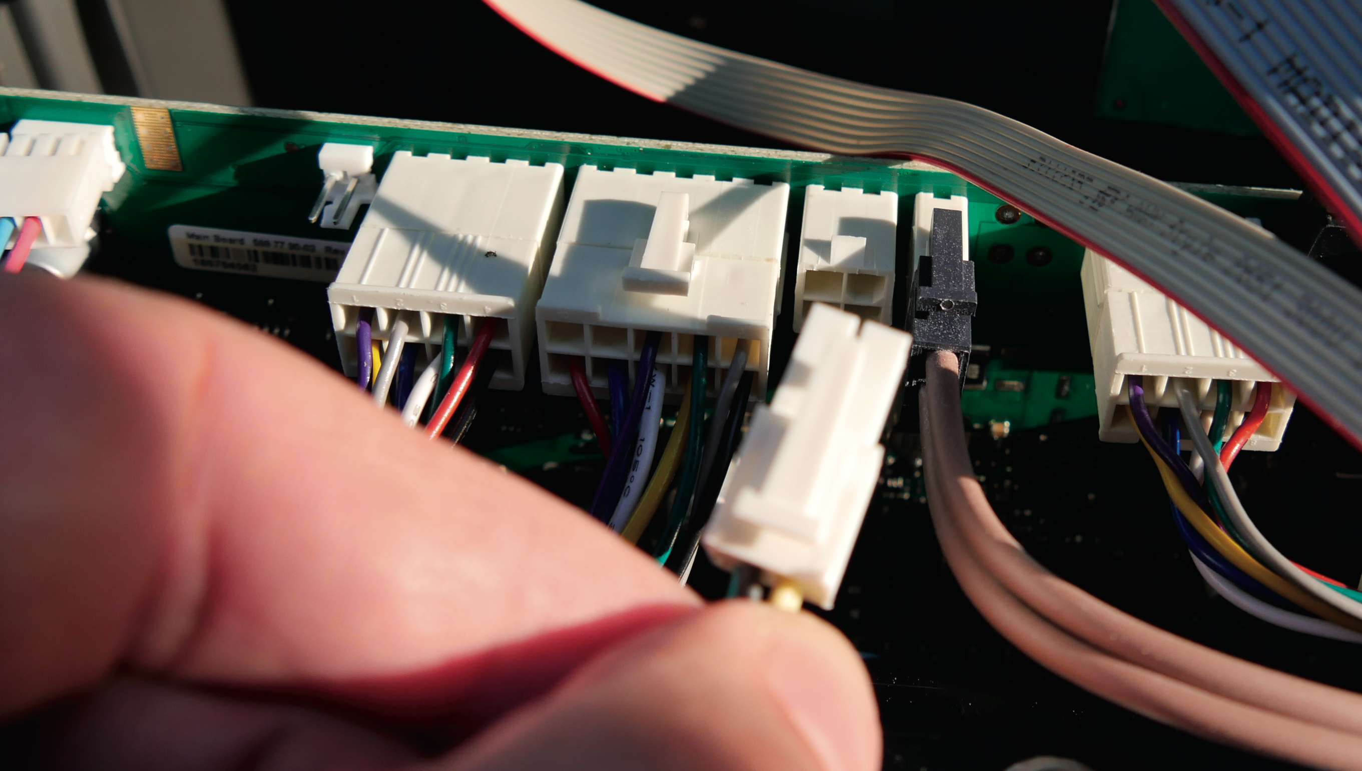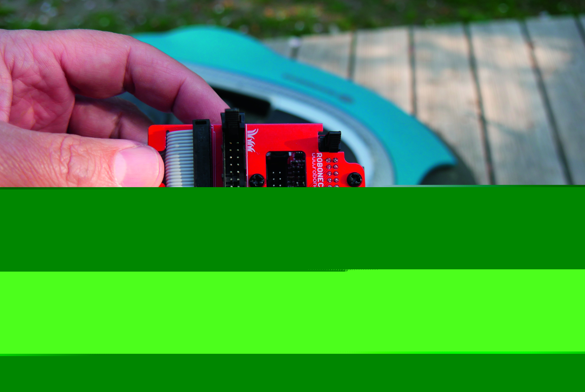 Ist die Haube geöffnet, zieht man zunächst den Stecker für die Stromversorgung, um die Steuerelektronik beim Einbau nicht zu beschädigen. Nun löst man den Pfostenstecker der oberen Bedieneinheit und verbindet ihn mit dem Robonect-Modul, das man wiederum mit der Steuerplatine des Mähers verbindet. Über zwei Klebepads befestigt man Robonect nun im Innern des Mähers und baut ihn – nach einem kurzen Funktionstest – wieder zusammen. Die gesamte Prozedur ist in einer Stunde erledigt.