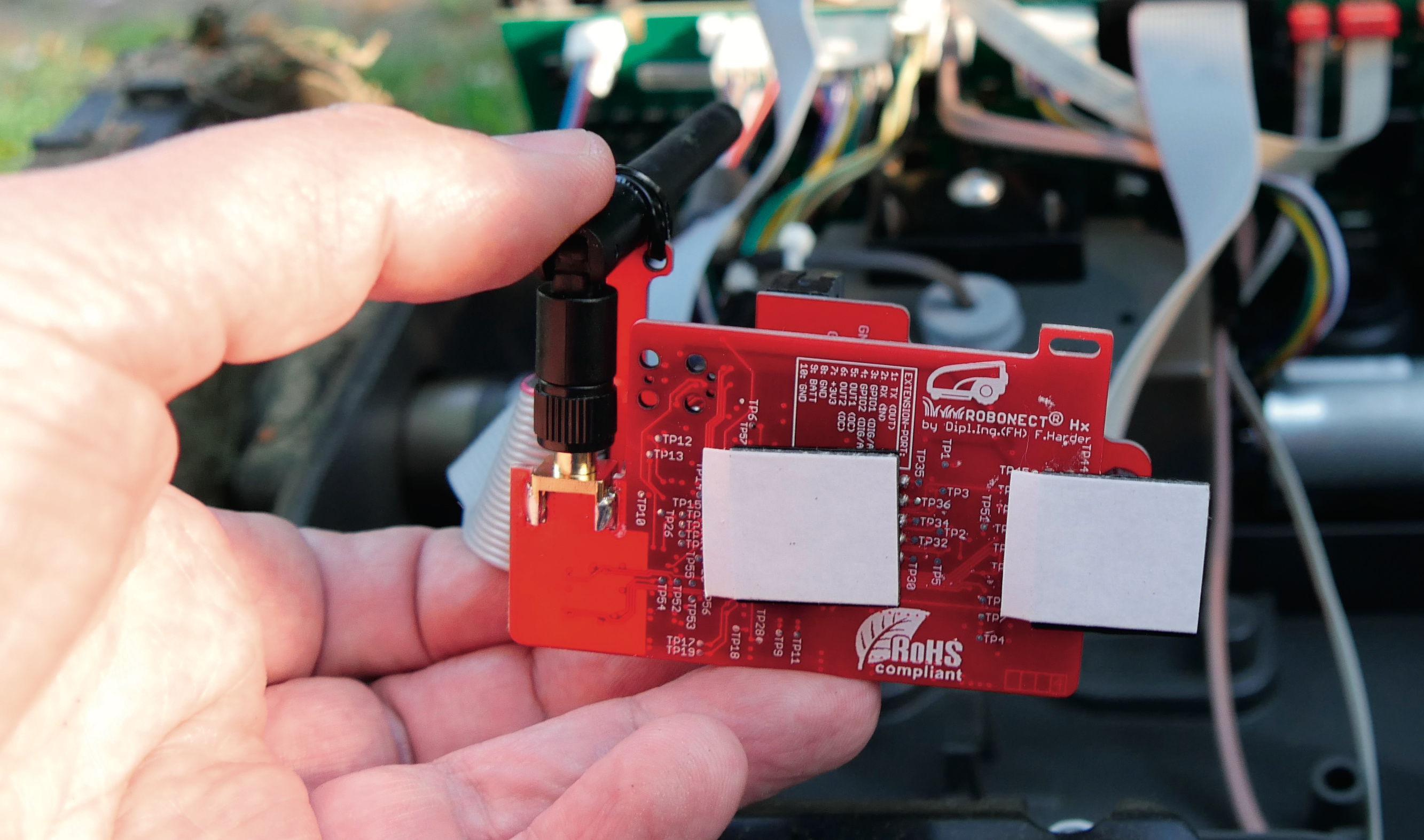 In diese Lücke stößt die Nachrüstplatine Robonect, die der Kieler Entwickler und Tüftler Fabian Harder für die Rasenmähroboter der Husqvarna-Gruppe entwickelt hat. Das Modul klinkt sich – für die bestehende Rasenmähersteuerung transparent – zwischen elektronischem Bedienfeld und Steuerelektronik ein und kann dem Mäher direkt Befehle übermitteln sowie umfangreiche Diagnoseinformationen abgreifen. Die Kommunikation nach außen geschieht per WLAN.