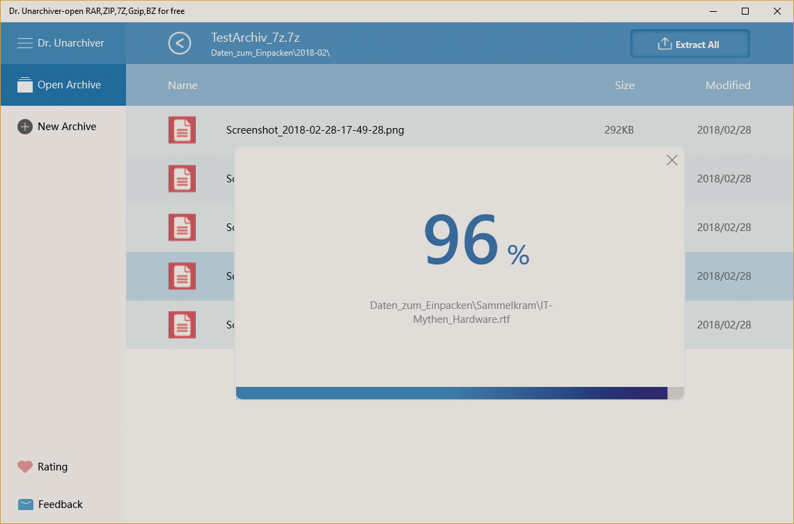 Die minimalistische Windows-10-App „Dr. Unarchiver-open“ entpackt Dateiarchive diverser Formate rasend schnell – beim Packen beherrscht sie dagegen nur Grundfunktionen.