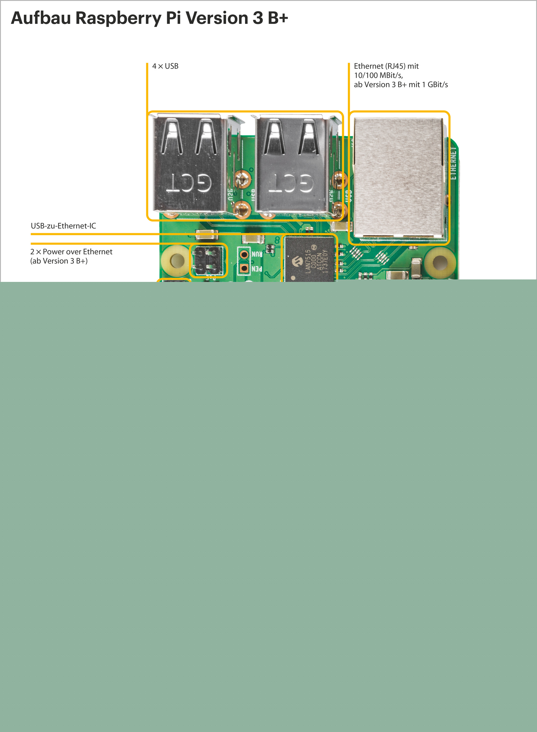 Das Betriebssystem kommt auf eine MicroSD-Karte; der Slot dafür befindet sich auf der Unterseite der Platine. Sonstige PC-Peripherie wird per USB 2.0 angebunden – USB 3.0, SATA oder PCIe kennt der Raspi nicht. Ein USB-Ethernet-Adapter ist bereits auf der Platine verbaut und als RJ45-Anschluss herausgeführt. Ebenso vier USB-A-Buchsen. Tastatur, Maus, aber auch etwa WLAN- oder Bluetooth-Adapter und andere Peripherie kann man darüber nachrüsten. Die beiden Funkverbindungen sind ab Raspi-Version 3 bereits auf der Platine mit verbaut.
