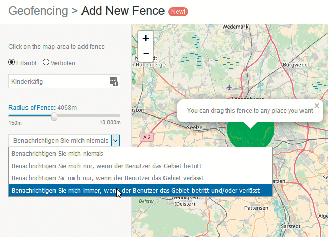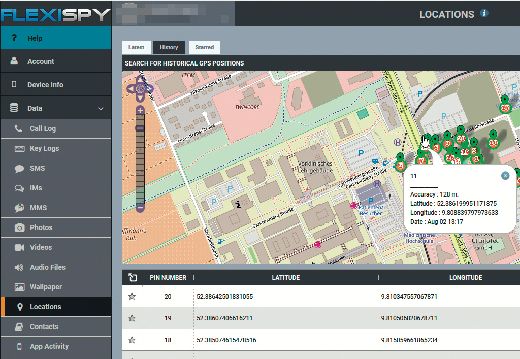 Ist die Spionage-App installiert und über ein Kennwort mit dem Dienst vernetzt, beginnt sie, Daten abzugreifen und laufend in die Cloud zu pumpen. Zu FlexiSpy und mSpy gehören komfortable Web-Dashboards, die diese Daten aufbereiten. Die Standorte etwa stellen beide Anbieter als Bewegungshistorie auf einer zoombaren Open-Streetmap-Karte dar. Über Geofencing-Funktionen lassen sich Gebiete festlegen. Verlässt oder betritt das Opfer den definierten Radius, alarmiert der Dienst seinen Kunden.