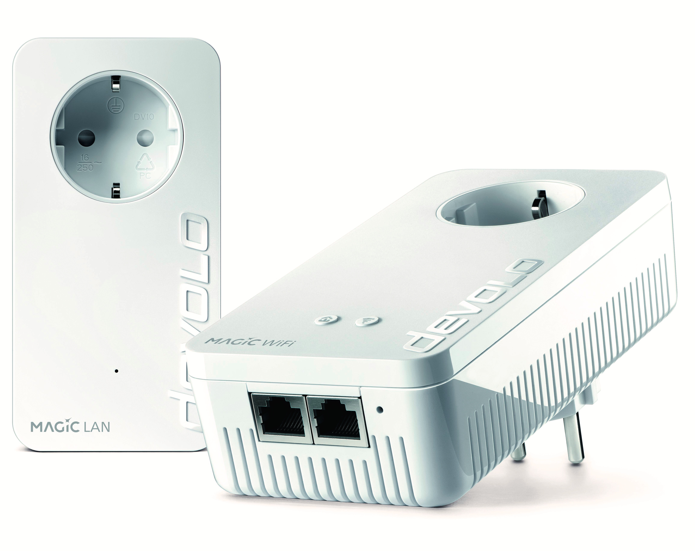 Zur IFA 2018 will der Aachener Hersteller Devolo in Halle 6.2 auf Stand 126 eine kleine Revolution zeigen: Die Powerline-Adapter der neuen Magic-2-Serie verdoppeln die maximale Bruttodatenrate auf der Stromleitung auf 2400 MBit/s. Bei guten Verbindungen sollte auch der Nettodurchsatz deutlich klettern, die heute üblichen 1200-MBit/s-Adapter schaffen auf Anwendungsebene bis zu 240 MBit/s (TCP). Konkrete Werte hat Devolo nicht verraten. Als Powerline-Chips dienen die G.hn-Wave-2-Bausteine 88LX5152 (Baseband) und 88LX2720 (Analog-Frontend) von Maxlinear. Sie sollen bis zu 1 GBit/s Nettodatenrate schaffen.