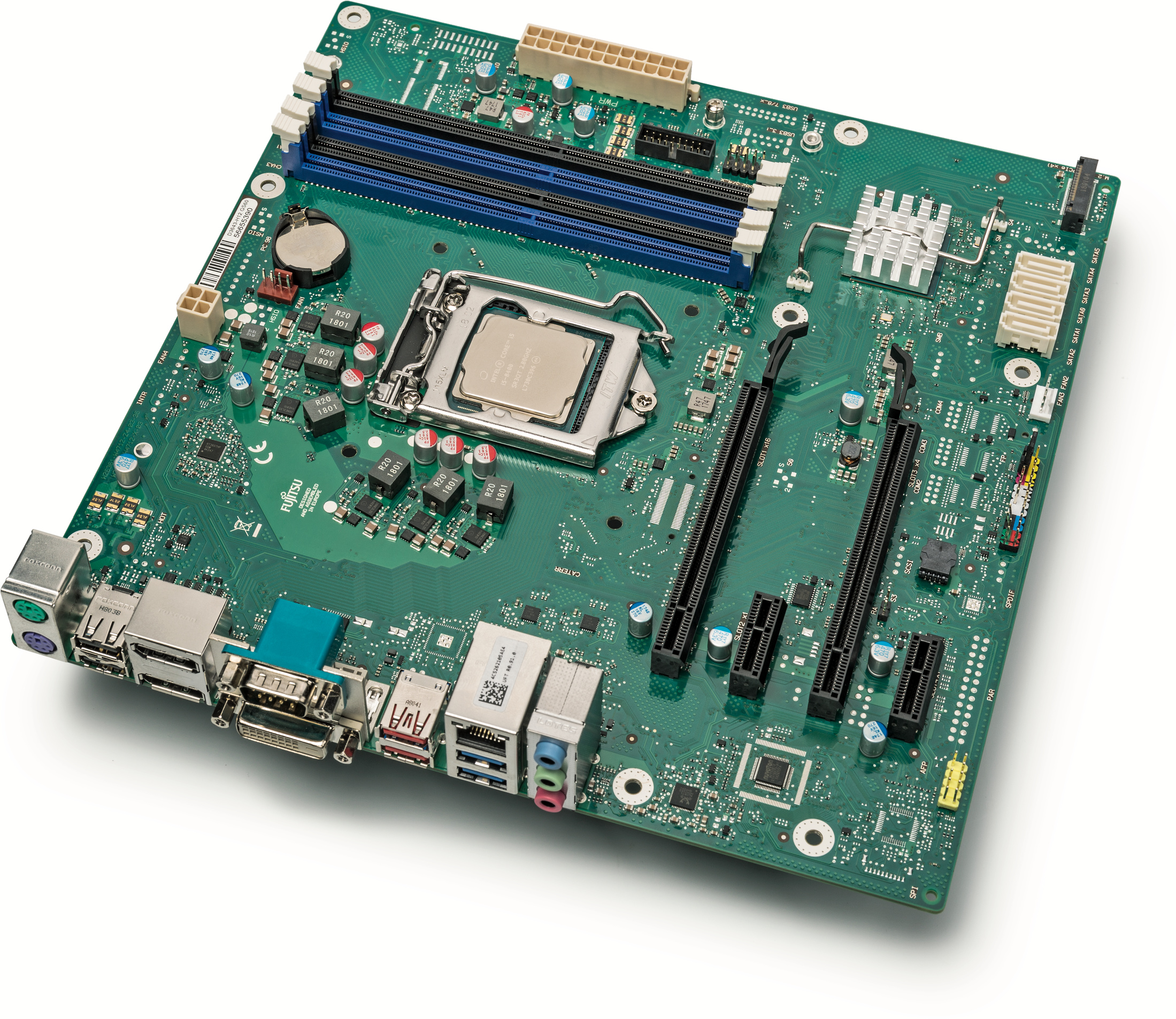 Auf dem Fujitsu-Mainboard D3643-H arbeitet ein Intel Core i-8000 besonders genügsam. Seine integrierte Grafik kann zwei 4K-Displays mit 60 Hz ansteuern.