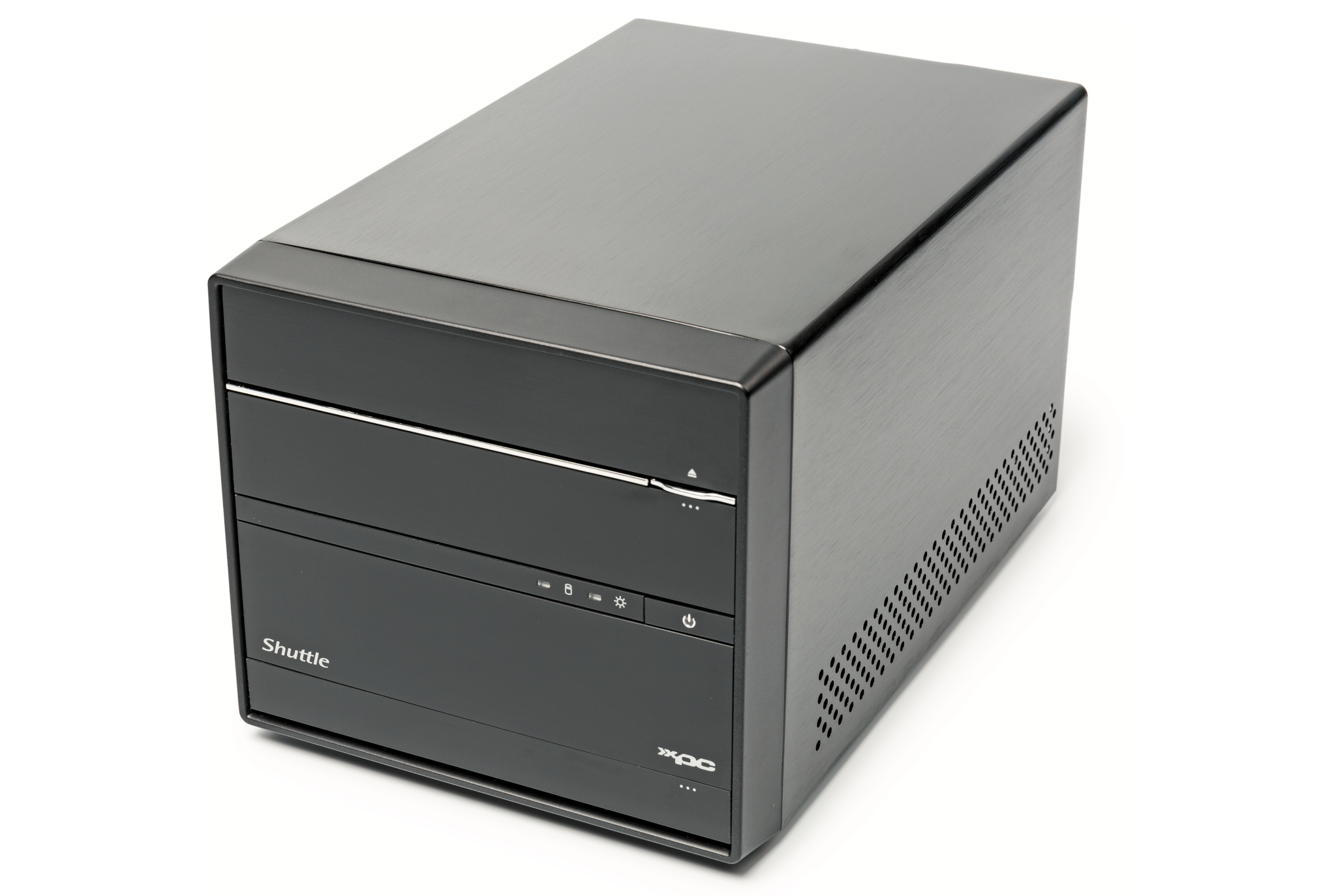 Neben einem Mini-PC wie Intels NUC wirkt der schwarze Shuttle-Quader zwar wuchtig, neben einem Microtower-Gehäuse hingegen kompakt. Shuttle nutzt das Volumen gut aus, eine Menge Erweiterungen passen hinein: außer dem Prozessor mit zwei bis sechs – und bald vielleicht sogar acht – Kernen noch vier Speichermodule, zwei 3,5-Zoll-Festplatten, ein optisches Laufwerk, zwei PCIe-Karten, eine M.2-SSD und ein WLAN-Adapter im M.2-Format. Satte 12 USB-Buchsen stehen bereit, davon vier mit USB 3.1 Gen 2, also SuperSpeedPlus mit 10 GBit/s. Auch SATA-RAID ist möglich. Typisch für Quader-Barebones von Shuttle ist der Heatpipe-Kühler für den Prozessor, bei dem der (92-mm-)Lüfter an der hinteren Gehäusewand sitzt und gleichzeitig die restlichen Komponenten kühlt. Ein zweiter Lüfter steckt im kompakten 300-Watt-Netzteil.