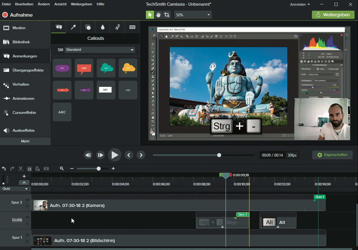 Camtasia 2018 von TechSmith schneidet Bildschirminhalt, Webcam-Material und Audio mit. Im Editor werden daraus fernsehtaugliche Tutorials oder Produktpräsentationen.