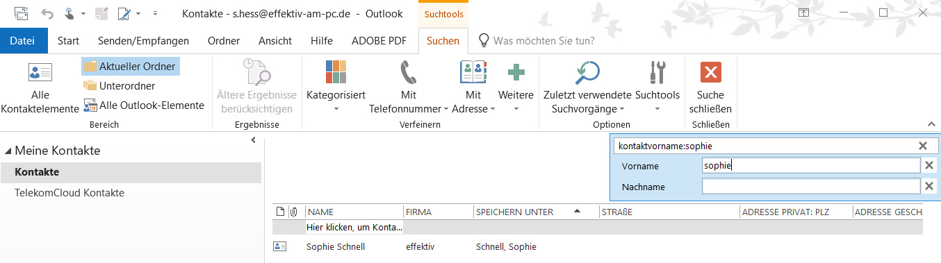Noch bessere Treffer liefert die Suche, wenn Sie über die Funktion „Weitere“ auf dem Menüband „Suchtools“ die Felder „Vorname“ und „Nachname“ aktivieren. Wenn Sie hierüber suchen, zeigt Outlook beispielsweise nur Treffer mit dem Vornamen Sophie, nicht aber Menschen, die in der Sophienstraße wohnen. Das ist insbesondere bei sehr umfangreichen Adressbüchern hilfreich. (apoi@ct.de)