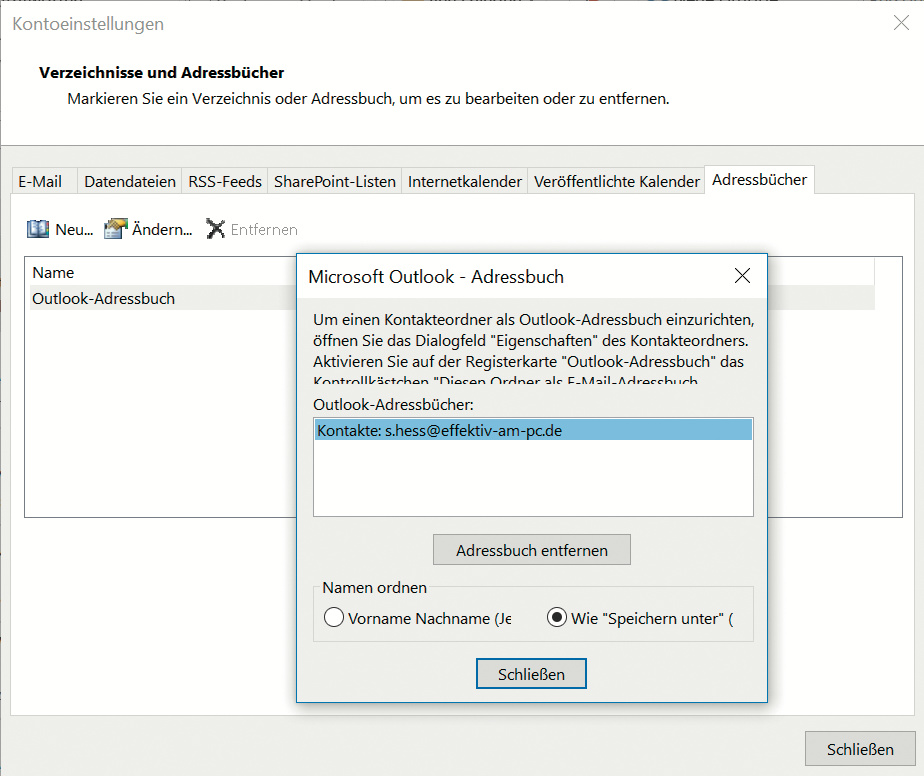 ¯!!! Das lässt sich ganz leicht einstellen. Rufen Sie dazu die Kontoeinstellungen auf: Datei/Kontoeinstellungen/Kontoeinstellungen/Adressbücher/Ändern. Im neu geöffneten Fenster finden Sie Optionen zu „Namen ordnen“. Voreingestellt ist „Vorname Nachname“. Um das von Ihnen gewünschte Anzeigeverhalten zu erzielen, wählen Sie stattdessen die Option „Wie ,Speichern unter‘“. Abschließend müssen Sie Outlook neu starten.