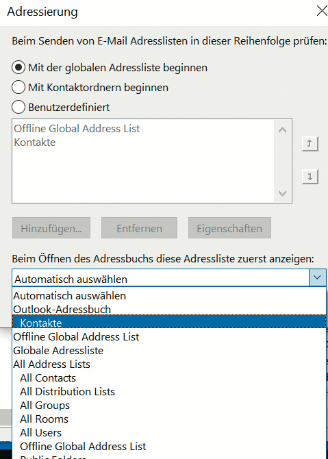 ¯??? Wenn ich eine E-Mail verfasse, Kontakte über das Adressbuch einfügen will und auf den „An“-Button klicke, erscheint immer als Erstes die globale Adressliste. Ich hätte aber gern meine eigenen Kontakte zuerst gesehen. Kann ich das einstellen?