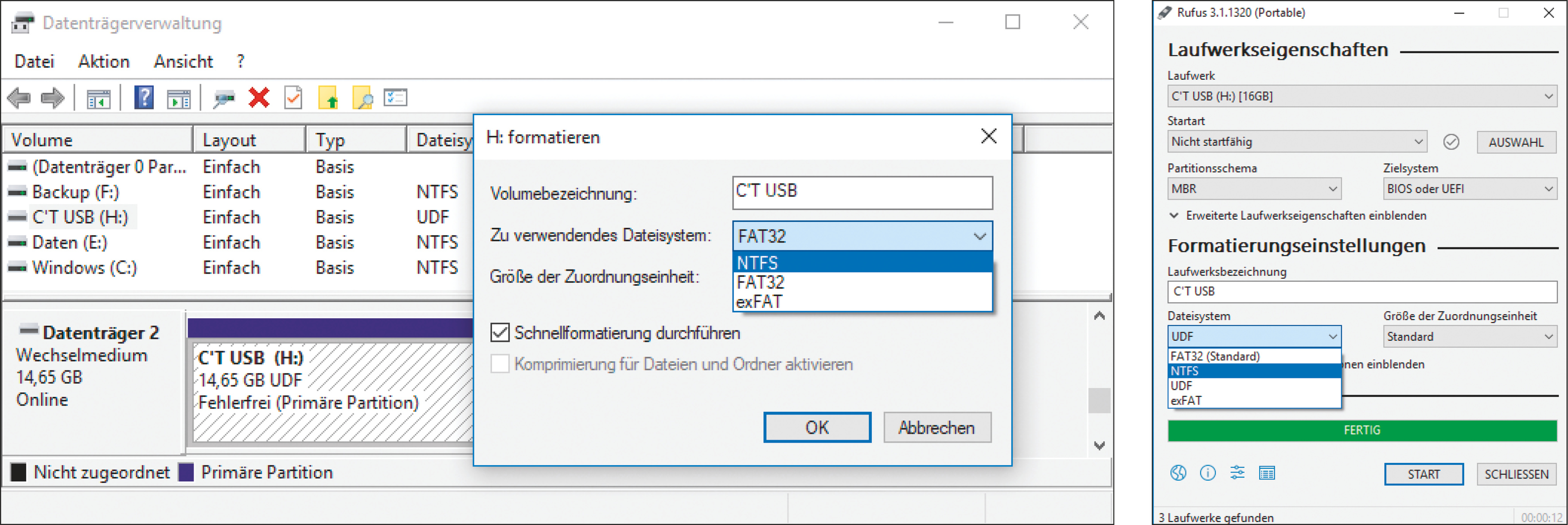 Weitaus mehr Möglichkeiten bietet das kostenlose Programm Rufus (siehe ct.de/yjn6). Damit lassen sich nicht nur USB-Sticks komfortabel partitionieren und formatieren, sondern auch bootfähig machen. Sogar Windows-Installationssticks kann Rufus erstellen, braucht dafür aber natürlich das ISO-Image. Rufus formatiert USB-Sticks auch wieder als UDF oder Legacy-FAT und lässt Sie zwischen MBR- und GPT-Modus wählen. (csp@ct.de)