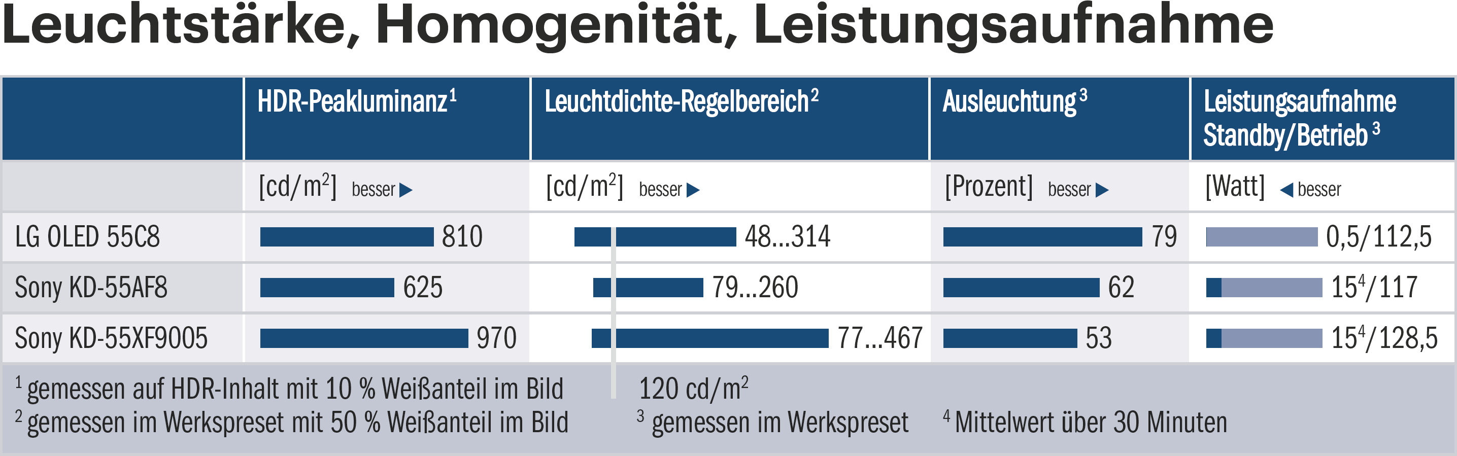 Beim LCD-TV handelt es sich um das KD-55XF9005 von Sony, die beiden OLEDs sind der LG 55C8 und der KD-55AF8, wiederum von Sony. Alle drei sind 55-Zöller mit 1,40 Meter Bilddiagonale, sie besitzen Doppeltuner, um eine TV-Sendung beim Schauen eines anderen Programms aufnehmen zu können und unterstützen das für besonders kontraststarke TV-Übertragungen entwickelte HLG-Format. Außerdem beherrschen sie die Wiedergabe des Hochkontrastformates HDR10 und der dynamischen Variante Dolby Vision.