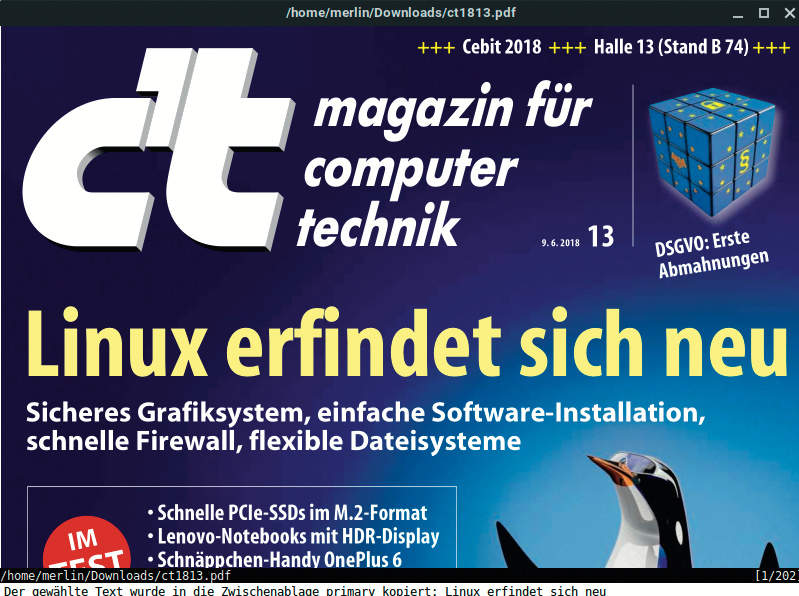 Zathura ist ein einfach gehaltener Betrachter für PDFs und E-Books mit Vim-ähnlicher Tastaturbedienung.