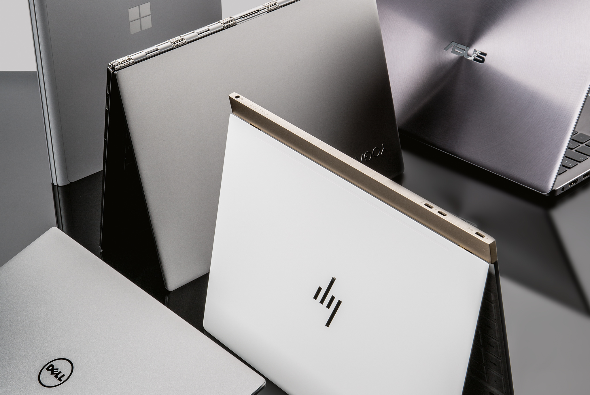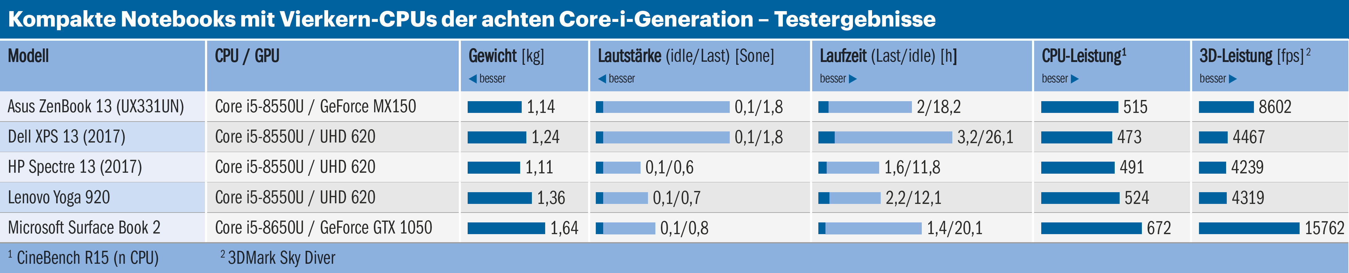 Während vergangene Wechsel von einer Core-i-Generation zur nächsten immer nur kleine Häppchen an höherer CPU-Rechenleistung brachten, ist Intels achte Core-i-Generation ein Riesenschritt nach vorne: Statt zwei gibt es nun vier Kerne, die mit gerade einmal 15 Watt TDP (Thermal Design Power) auskommen. Wir haben für diesen Test die mobilen Flaggschiffe der großen Hersteller versammelt: Asus ZenBook 13, Dell XPS 13, HP Spectre 13, Lenovo Yoga 920 und Microsoft Surface Book 2. Sie kosten zwischen 1400 und 3450 Euro. Das im September angekündigte Leichtgewicht Acer Swift 5 war zum Testzeitpunkt immer noch nicht verfügbar. Apple hat bis dato keine MacBooks mit achter Core-i-Generation vorgestellt.