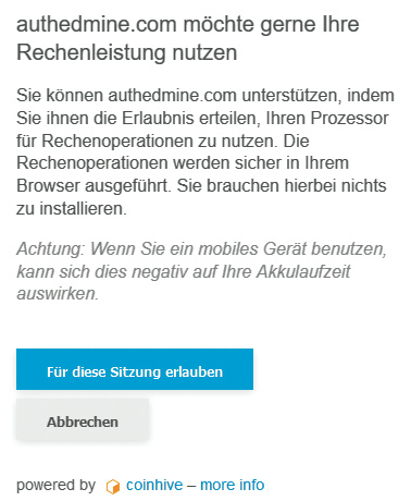 Da die gängigen Adblocker Coinhive jedoch unabhängig vom Vorhandensein einer Nachfrage beim Besucher blockieren, haben die Entwickler vor kurzem das AuthedMine-Projekt ins Leben gerufen. Dabei handelt es sich um eine Coinhive-Implementierung, die den Besucher in jeder Sitzung explizit um Zugriff auf die Rechenleistung der CPU bittet. Auf der Internetpräsenz des AuthedMine-Projekts betonen die Coinhive-Entwickler, dass es keinerlei Grund gebe, die neue Mining-Variante zu blockieren. Letztlich wissen aber nur sie selbst, ob sich hinter AuthedMine tatsächlich nutzerfreundliche Absichten oder nicht doch eher die Angst vor finanziellen Verlusten verbirgt.