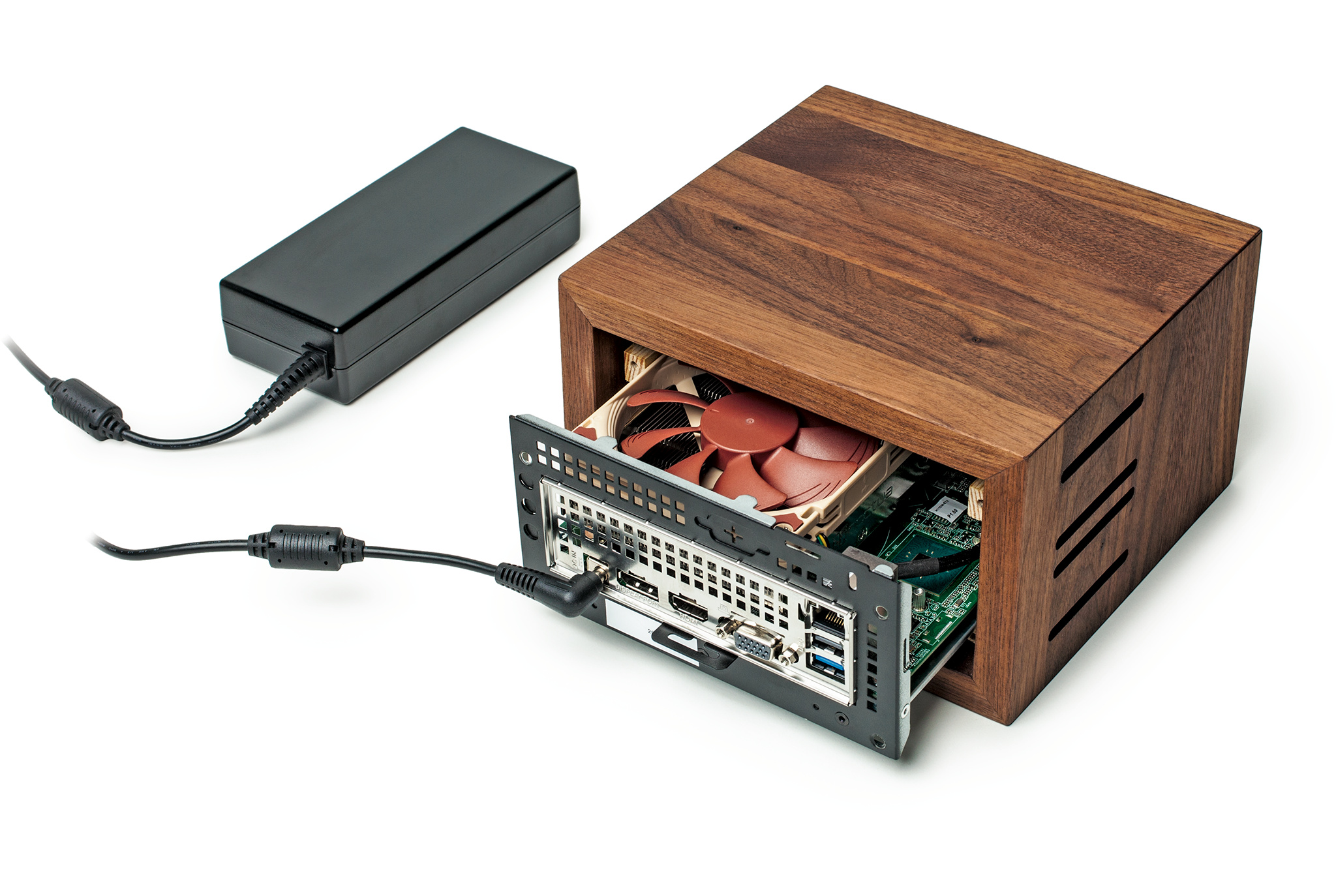 Die technischen Daten des Homie sind wenig spektakulär: Im ansehnlichen Nussbaumholzgehäuse steckt ein PC-Barebone von ASRock. Auf Wunsch des Kunden liefert der Hersteller auch Sonderausstattungen, etwa eine zweite Festplatte, die dann mit der Standardplatte ein RAID bildet. Üblicherweise vertreibt er das System über Amazon für 999 Euro. Für die nackte Hardware in Form eines Bausatzes und mit normalem Blechgehäuse müsste man beim PC-Teilelieferanten mindestens 360 Euro berappen.
