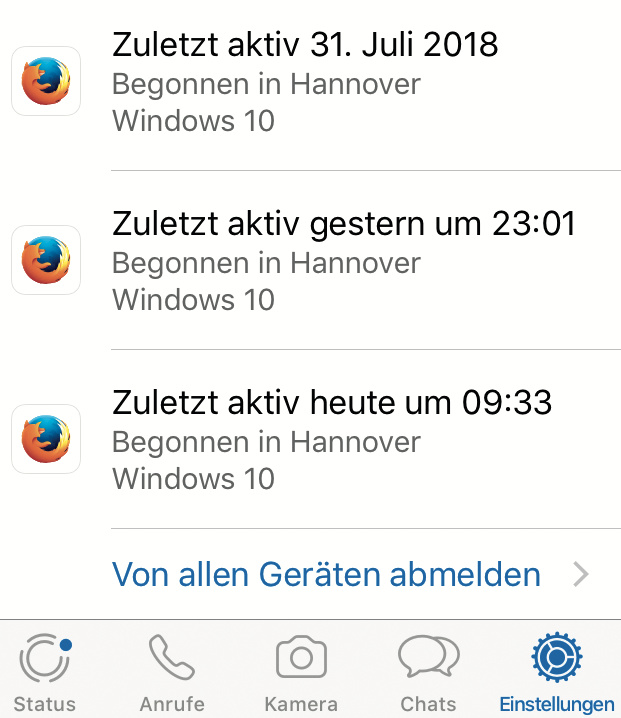 In der App sollten Sie deshalb im Einstellungsmenü unter „WhatsApp Web“ kontrollieren, welche Geräte derzeit angemeldet sind. Nicht benötigte oder gar unbekannte Geräte können Sie einzeln die Autorisierung entziehen.