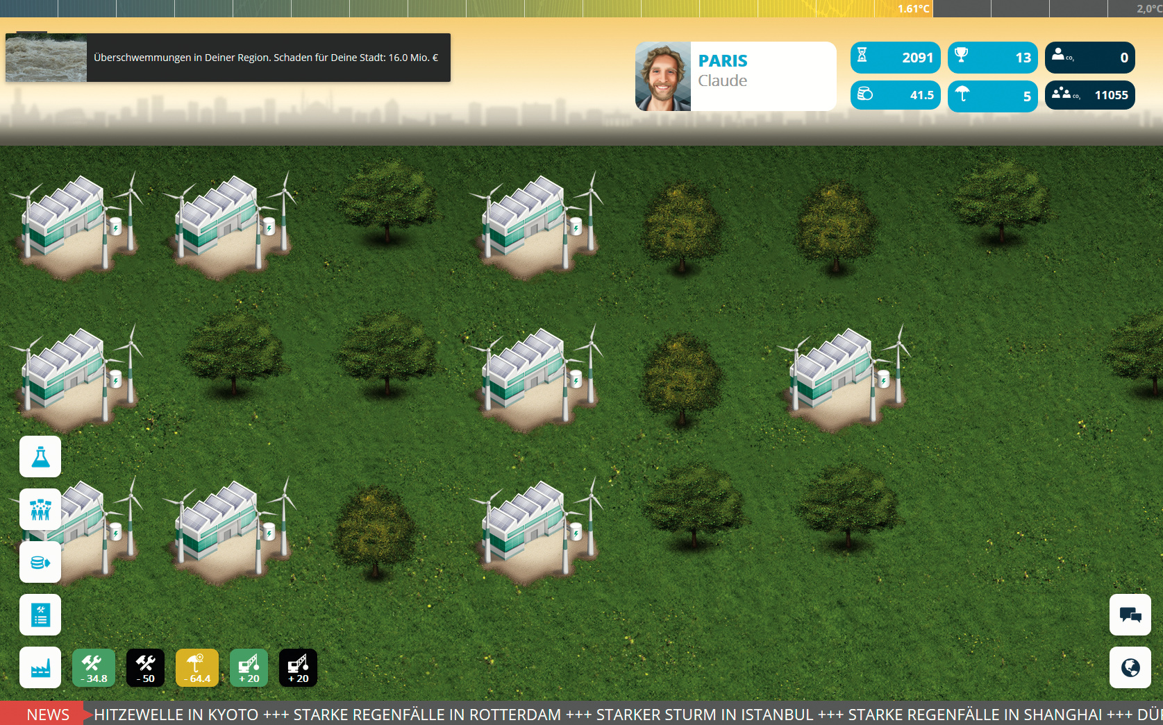 Bis zu 50 Spieler können an einer Partie „Keep Cool mobil“ teilnehmen. Ihre Entscheidungen im Spiel wirken sich auf die wirtschaftliche Entwicklung ihres eigenen Standorts aus, aber auch auf das Klima der gesamten Erde.