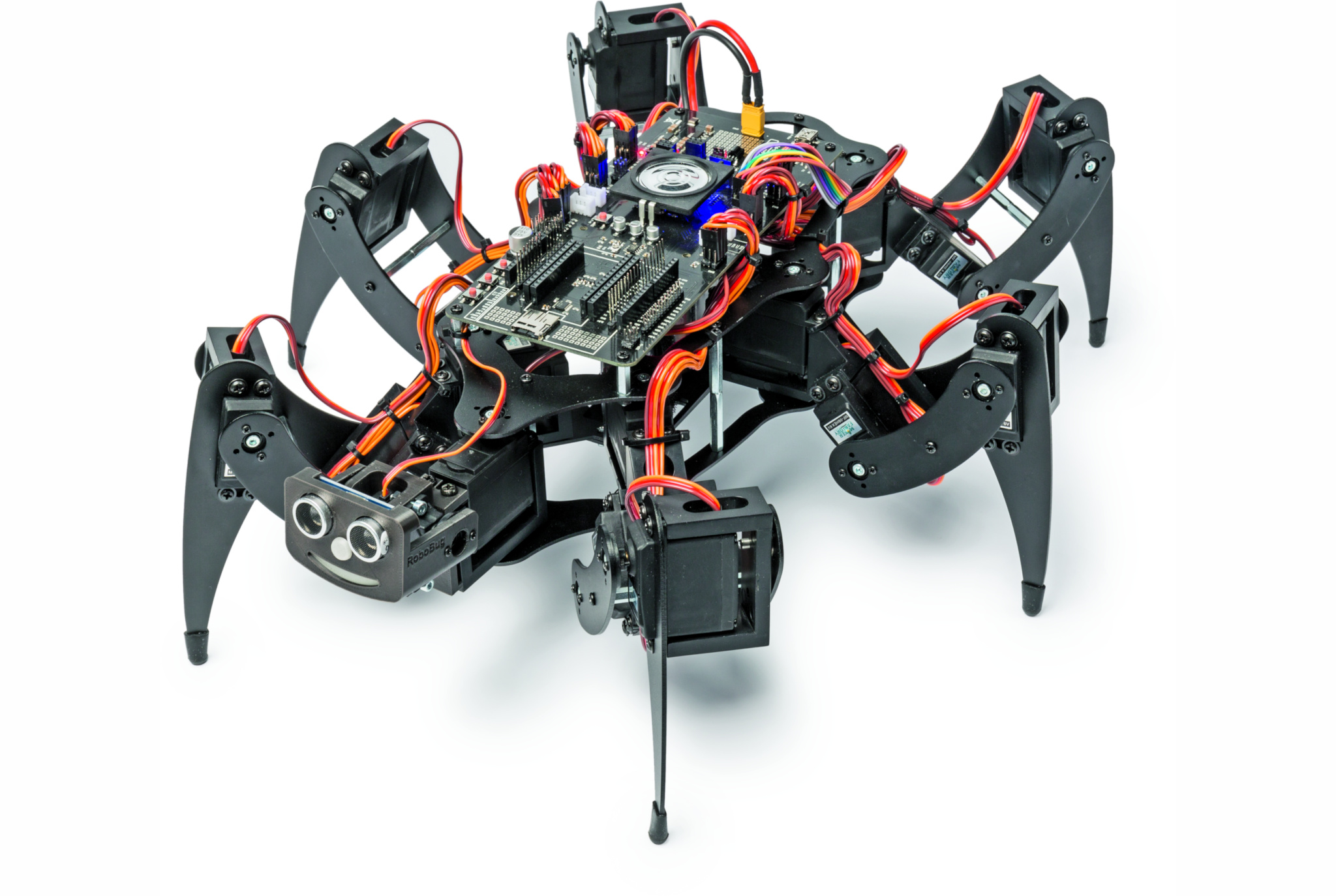 Bausätze für Hexapod-Roboter gibt es schon länger, sie sind aber entweder recht teuer oder ihre mechanischen Komponenten auf schonende Behandlung angewiesen. Der Robobug getaufte Bausatz von Conrad gehört mit 500 Euro zu den günstigeren Modellen. Er ist dennoch mit einer recht stabilen Aluminium-Konstruktion versehen, die den regelmäßigen Kontakt mit einer Schulklasse oder Projektgruppe nicht scheuen muss.