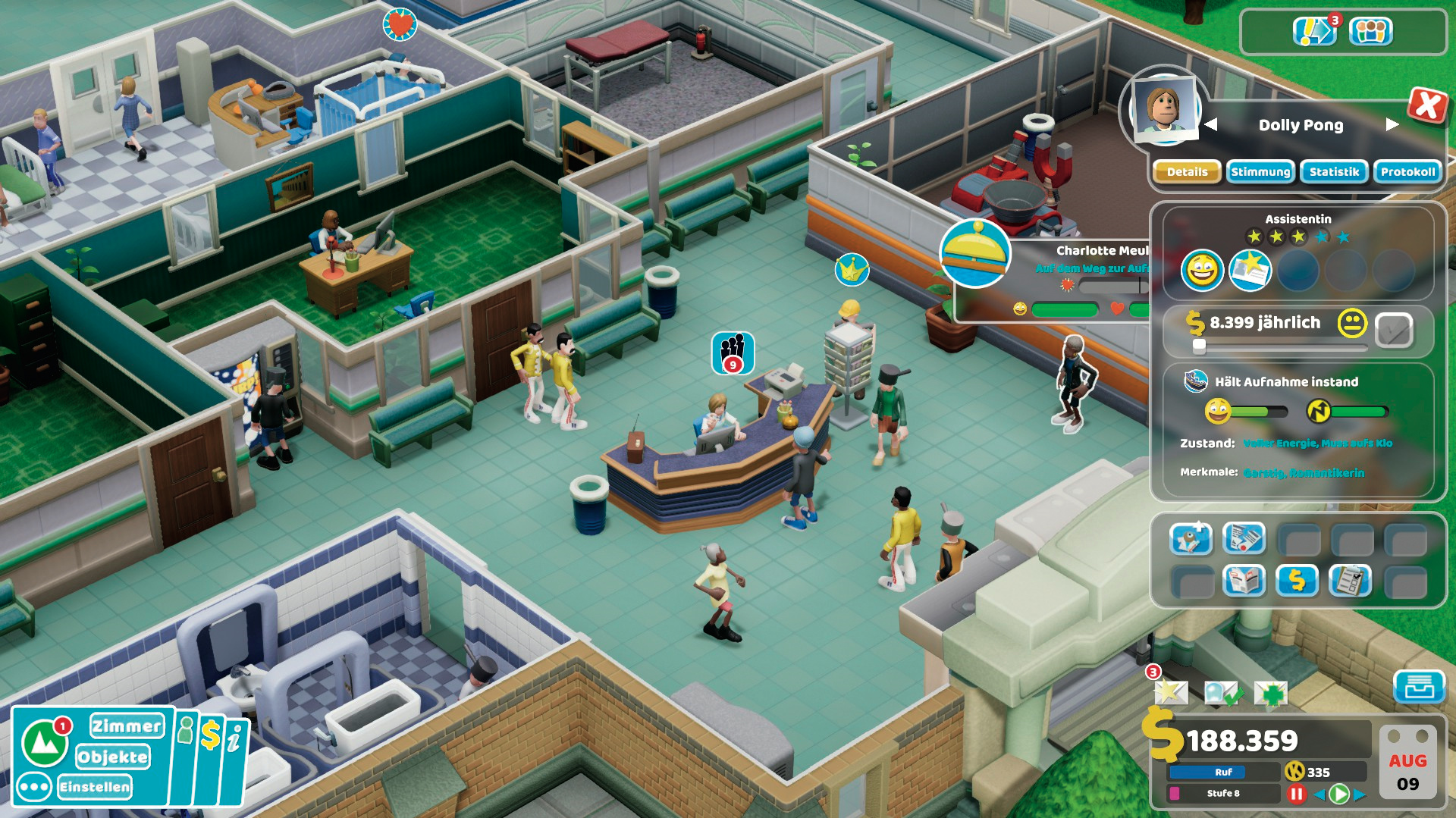 Two Point Hospital ist ein Wimmelbild aus witzigen Krankheiten, bei dem man ständig Gefahr läuft, den Überblick zu verlieren.