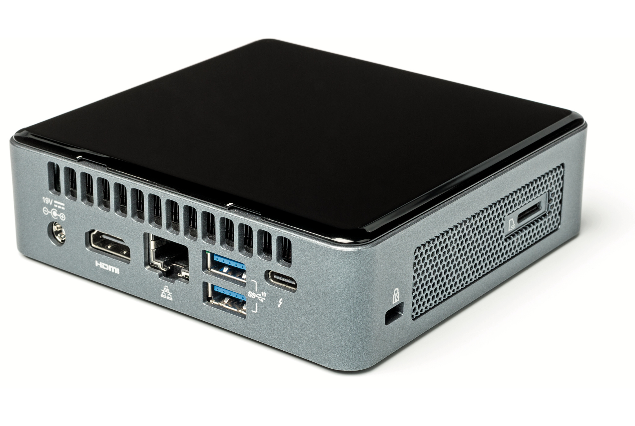 NUC-Barebones sind oft die ersten unter den Mini-PCs, die neue Technik in die Händlerregale bringen. Bei der achten NUC-Generation „Bean Canyon“ ist wieder Thunderbolt 3 mit an Bord. Dessen Typ-C-Buchse verbindet blitzschnellen Datentransfer mit 4K-tauglichem DisplayPort und der Option, über USB Power Delivery bis zu 15 Watt Leistung bereitzustellen.
