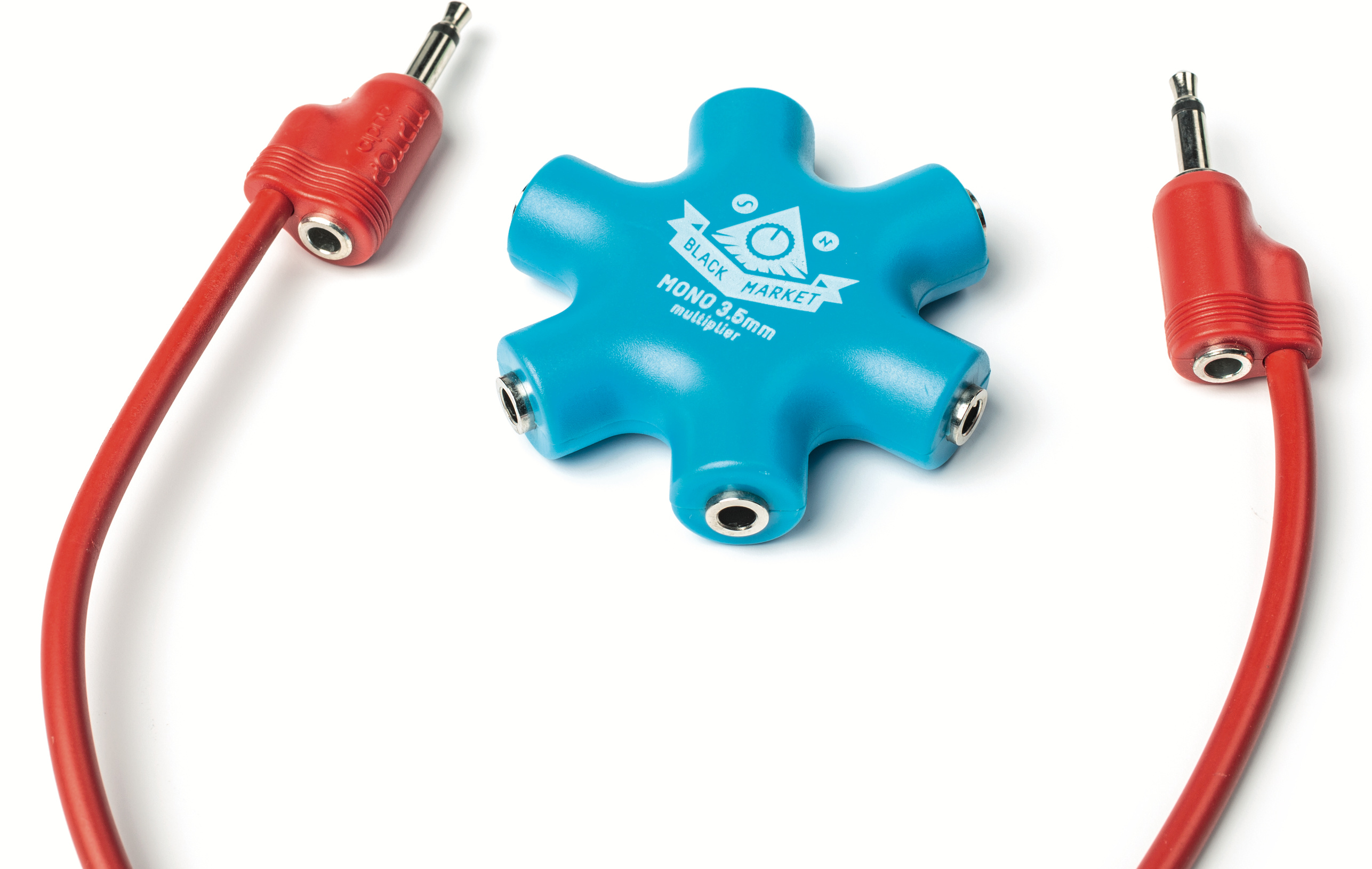 ¯!!! Patch-Kabel dienen der Übertragung von Audio-, Steuer- und Trigger-Signalen. Jedes Ende hat eine Mono-Klinke (3,5 mm). Steuersignale lassen sich über einen Verteiler (Mult) von einem Sender an mehrere Empfänger schicken. Bei passiven ungepufferten Mults sackt dabei die Spannung ab. Sollen mehrere VCOs mit einer Steuerspannung kontrolliert werden, empfiehlt sich der Einsatz gepufferter aktiver Mults, die den Spannungsabfall und damit eine Tonabsenkung verhindern. Mit einem Abschwächer (Attenuator) lässt sich eine Steuerspannung gezielt reduzieren.