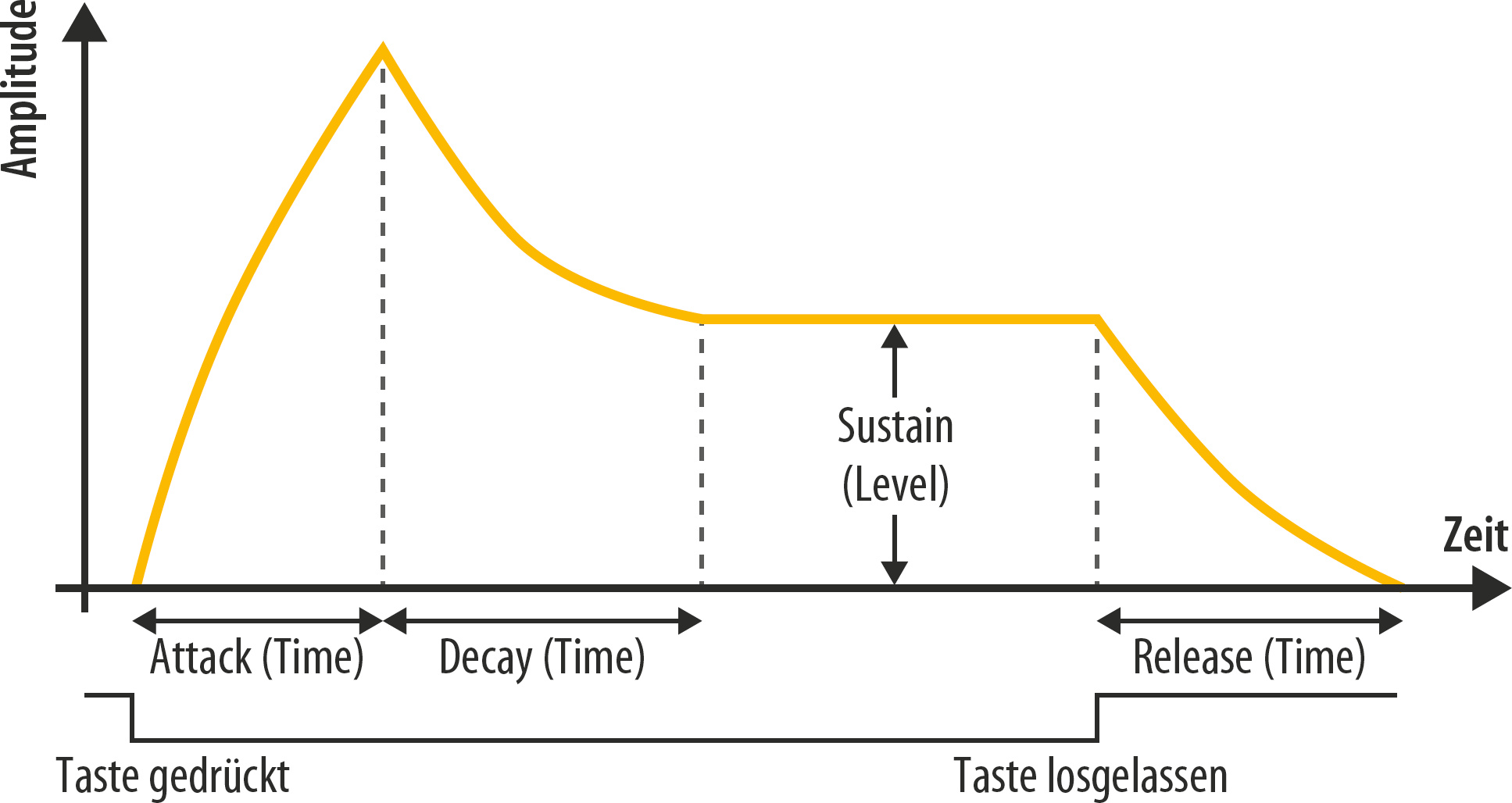 ¯!!! Der Hüllkurvengenerator (Envelope Generator, EG) erzeugt eine Steuerspannung, die einen zeitlichen Verlauf reguliert, etwa den Frequenzverlauf eines VCO, den Lautstärkeverlauf des VCA oder die Grenzfrequenz eines VCF. Angestoßen wird er von einem Trigger oder Gate-Signal. Der zeitliche Ablauf der Hüllkurve beim Anschlagen einer Note lässt sich meist in vier Bereiche „ADSR“ aufteilen: Attack (Anschlagzeit, bis das Maximum erreicht wird), Decay (Abfallzeit, in der das Signal vom Maximum auf den Sustain-Pegel zurückfällt), Sustain (Pegel, auf dem die Note weiterklingt, solange sie gehalten wird), Release (Abfallzeit, vom Loslassen der Note bis zu ihrem Verstummen). Einfache Hüllkurven für perkussive Töne haben manchmal nur Parameter für Attack und Decay. Manche Hüllkurvengeneratoren lassen sich per Cycle-Knopf in einen Oszillator oder LFO verwandeln.