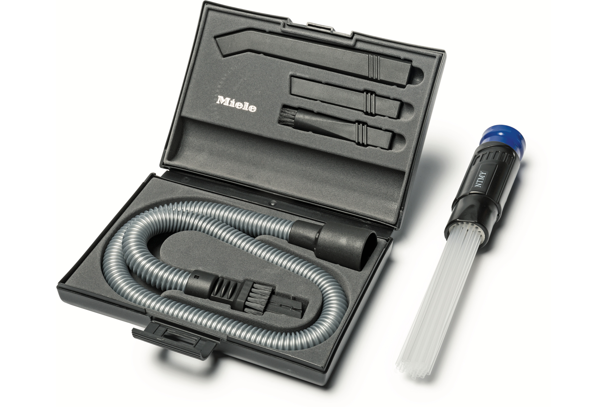 Steifes Strohhalm-Bündel gegen Luxus-Set mit weichen Borsten: Wir haben unterschiedliche Aufsätze für handelsübliche Bodenstaubsauger ausprobiert. Beide erreichen enge Gehäuseecken, in denen sich Staub und Schmutz gesammelt hat. Doch die Unterschiede in (Pass-)Form und Handhabung sind groß: Im Vergleich zum günstigen, rustikalen Aufsatz aus China wirkt das Miele-Set aus dem Köfferchen wie ein Werkzeug für Chirurgen.