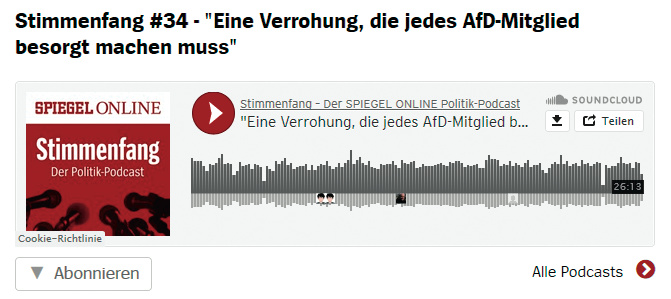 Etwas steifer geht es im Stimmenfang zu, dem wöchentlichen Politik-Podcast von Spiegel Online. Darin widmet sich Yasemin Yüksel (Chefin vom Dienst im „Bewegtbild-Ressort“) rund 30 Minuten lang einem einzigen Thema. Oft holt sie sich Expertise aus der Redaktion hinzu. Spannend wird es aber vor allem, wenn Hörer zu Wort kommen und ihre Sicht auf die Dinge erzählen.
