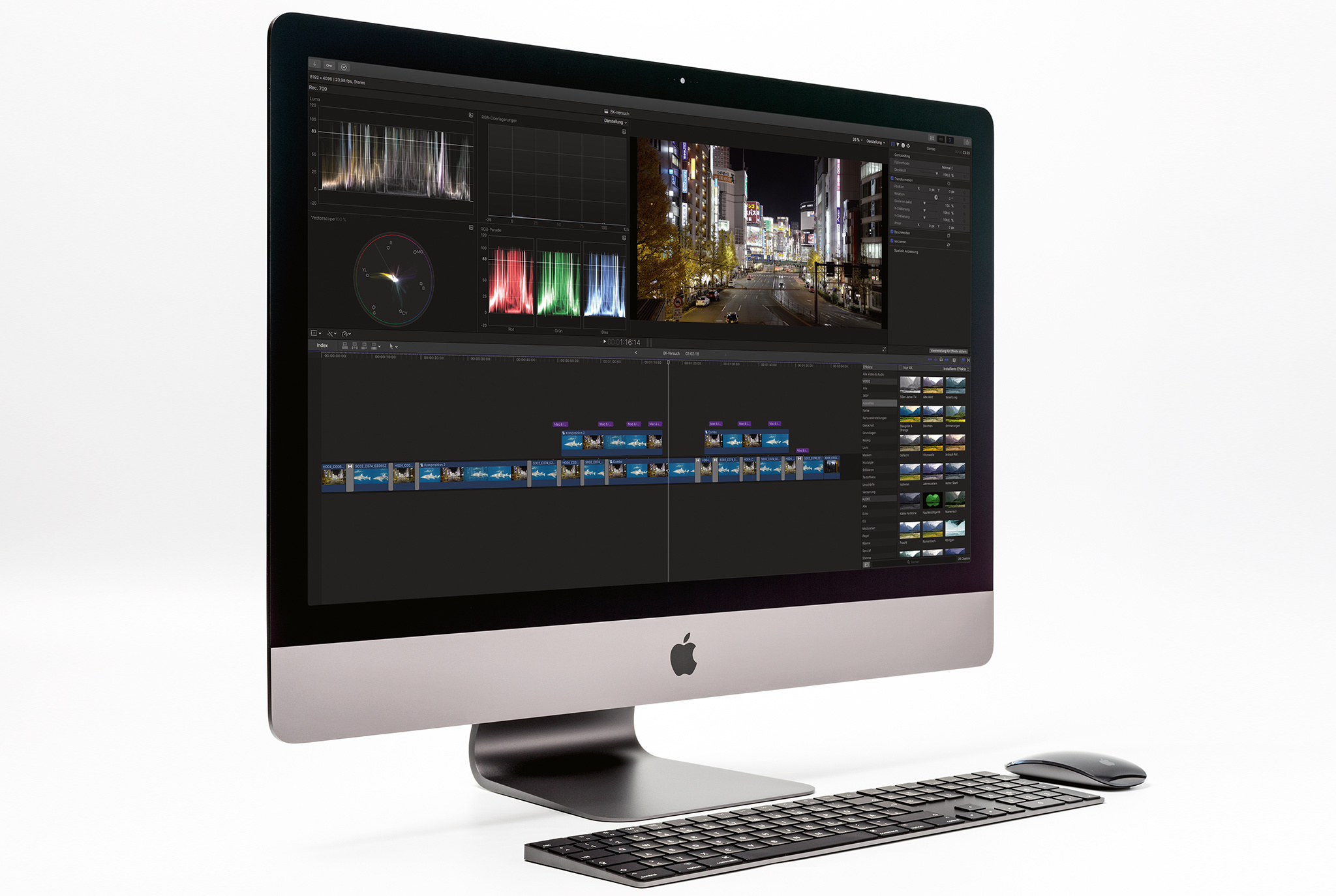 Zumindest beim Einstiegsmodell stellt sich die Frage, ob man mit einem hochgerüsteten iMac nicht genauso gut fährt. Um dies zu prüfen, ließen wir den iMac Pro in der Standard-Konfiguration mit Achtkern-CPU, 32 GByte RAM und 1-TByte-SSD gegen einen iMac mit Core-i7-Prozessor, Radeon Pro 580 und ansonsten vergleichbarer Ausstattung antreten. Der ist mit 4280 Euro gut einen Tausender günstiger. Beide Geräte stellte uns freundlicherweise Gravis zur Verfügung.