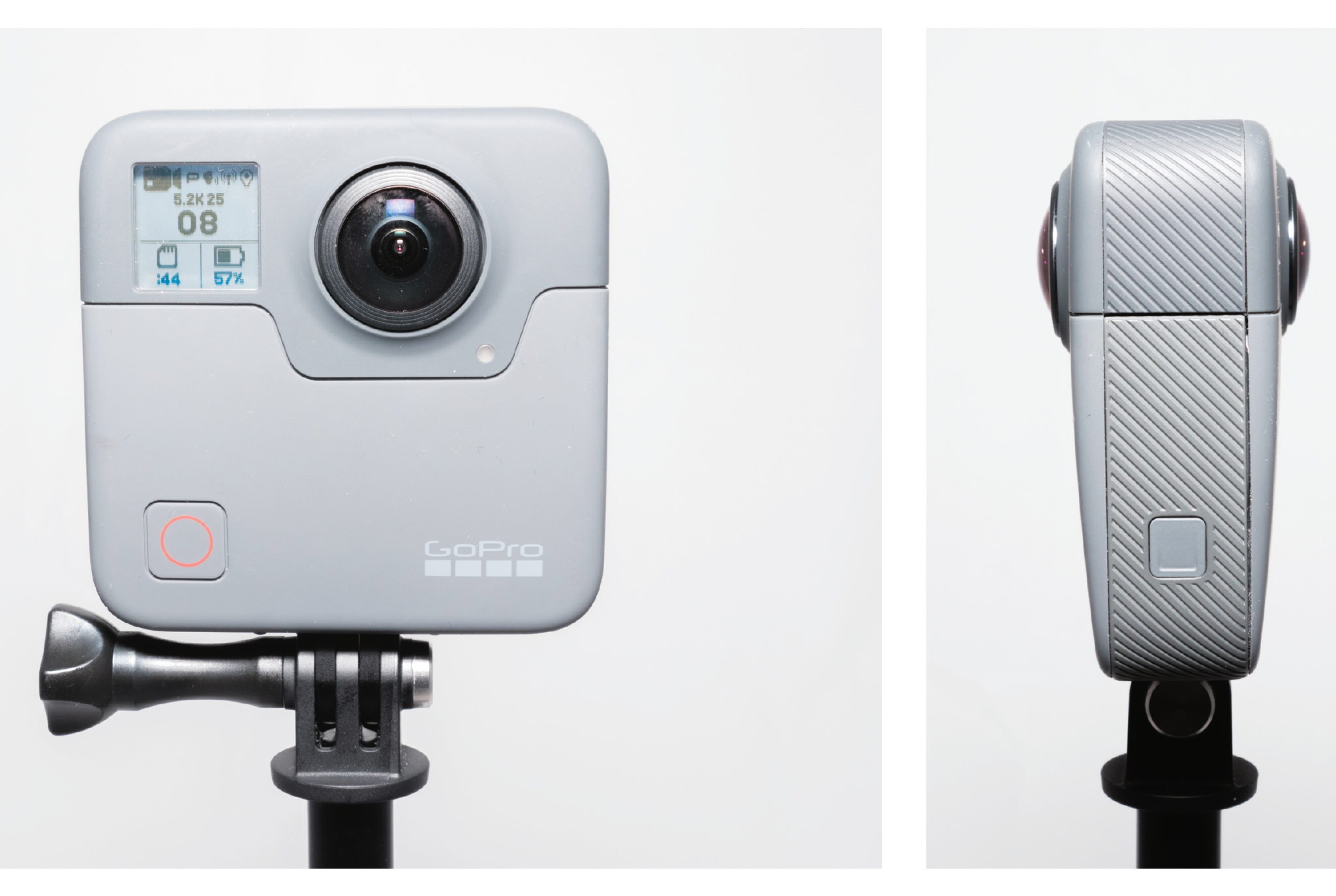 Für den 360-Grad-Rundumblick nutzt die 750 Euro teure GoPro Fusion zwei Kameras – eine auf ihrer Vorder- und eine der Rückseite. Passend dazu muss man sie mit zwei MicroSD-Karten gleichzeitig bestücken. Den Aufnahmemodus wählt man über einen Knopf an der Gehäuseseite, vorne befindet sich der Auslöser sowie ein LC-Display. Eine rote LED an beiden Seiten zeigt an, wenn eine Aufnahme läuft.