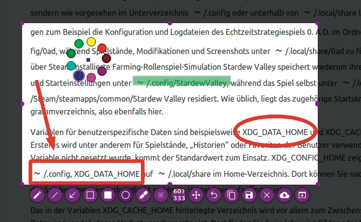 Beim Anfertigen von Screenshots für bebilderte Anleitungen, Blogs und anderes erweist sich Flameshot als wirklich schnell. Den zu knipsenden Bereich auf dem Bildschirm zieht man mit der Maus auf. Die Auswahl lässt sich verschieben oder mit den Anfassern am Rand anpassen. Die Größe der Auswahl in Pixeln zeigt ein Icon am Rand an.
