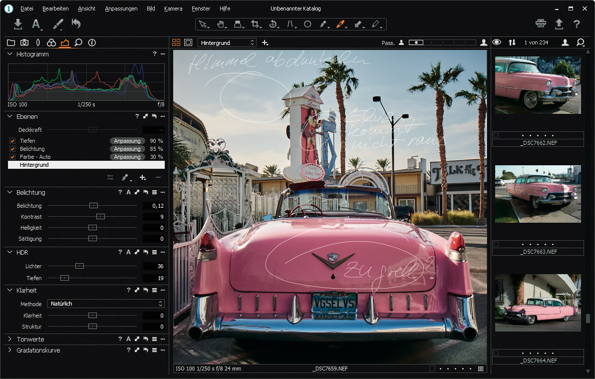 Die Oberfläche ist auf Effizienz getrimmt. Am rechten Bildrand hat der Nutzer eine Bibliotheksleiste ständig im Blick. Hier kann er mit Pfeiltasten durch die Bilder wechseln, sie im Dokumentenfenster beurteilen und mit Zifferntasten bewerten. Ein Tastendruck erzeugt eine virtuelle Kopie. So lassen sich Fotos in verschiedenen Varianten bearbeiten.
