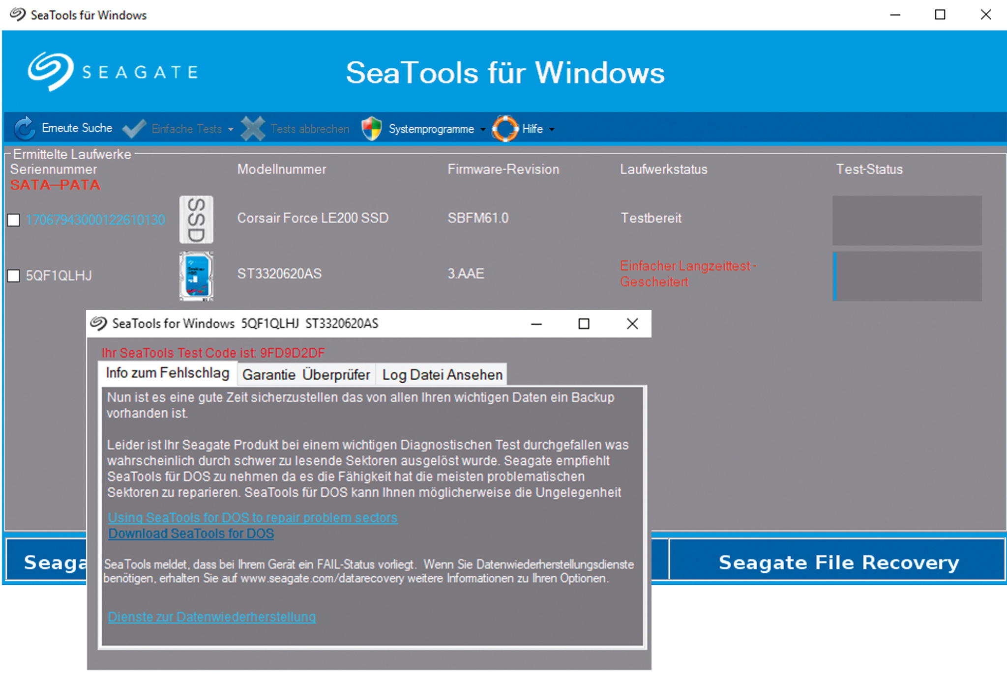 Zur Früherkennung haben die Festplattenhersteller bereits vor vielen Jahren den SMART-Standard ersonnen (SSDs gab es damals noch nicht). SMART (Self-Monitoring, Analysis, and Reporting Technology) gibt über standardisierte Schnittstellen Informationen zum Gesundheitszustand heraus; auch SSDs unterstützen diesen. Den SMART-Standard interpretieren die einzelnen Hersteller jedoch unterschiedlich: Einzelne Datenfelder und -inhalte unterscheiden sich, sodass etwa ein Seagate-Tool bei einer WD-Festplatte wahrscheinlich falsche Werte ausgeben würde. Mit passenden Programmen kann man die Laufwerke trotzdem überwachen und sich so vor einem möglichen Ausfall warnen lassen.