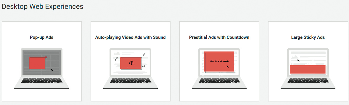 Google hatte in den vergangenen Monaten zirka 100.000 Websites samt der darauf ausgespielten Werbung überwacht, um Publisher zu identifizieren, die unerwünschte Werbeformen zulassen. Webmaster, die wissen wollen, ob Google ihre Sites auf dem Index hat, müssen in Googles Webmaster Tools nachsehen. Dort listet der „Ad Experience Report“ unzulässige Werbeformen auf. Google gibt den Betreibern betroffener Sites nach einem Fund 30 Tage lang Zeit, den Missstand zu beheben.