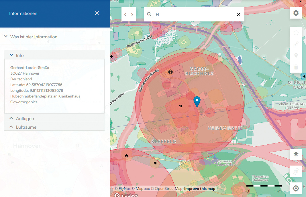 Die Online-Karte von Map2Fly soll Drohnenpiloten das Leben leichter machen. Sie zeigt die gesperrten Lufträume und Hindernisse am Boden an, zum Beispiel Hubschrauberlandeplätze, Wohngebiete und Kraftwerke, und markiert die Sperrzonen farbig. Nach einem Rechtsklick auf einen Punkt erläutert sie die dort geltenden Auflagen.