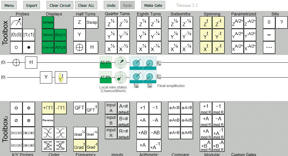 In Quirk repräsentieren horizontale Linien Qubits. Dem Experimentator stehen ein paar Dutzend Komponenten zur Verfügung, die er auf die Qubits ziehen kann, um ihr Verhalten zu beeinflussen: logische Komponenten, mathematische Funktionen und Elemente, die die Zustände mehrerer Qubits verknüpfen. Quirk besitzt sogar einen Editor, mit dem man eigene Komponenten bauen kann.