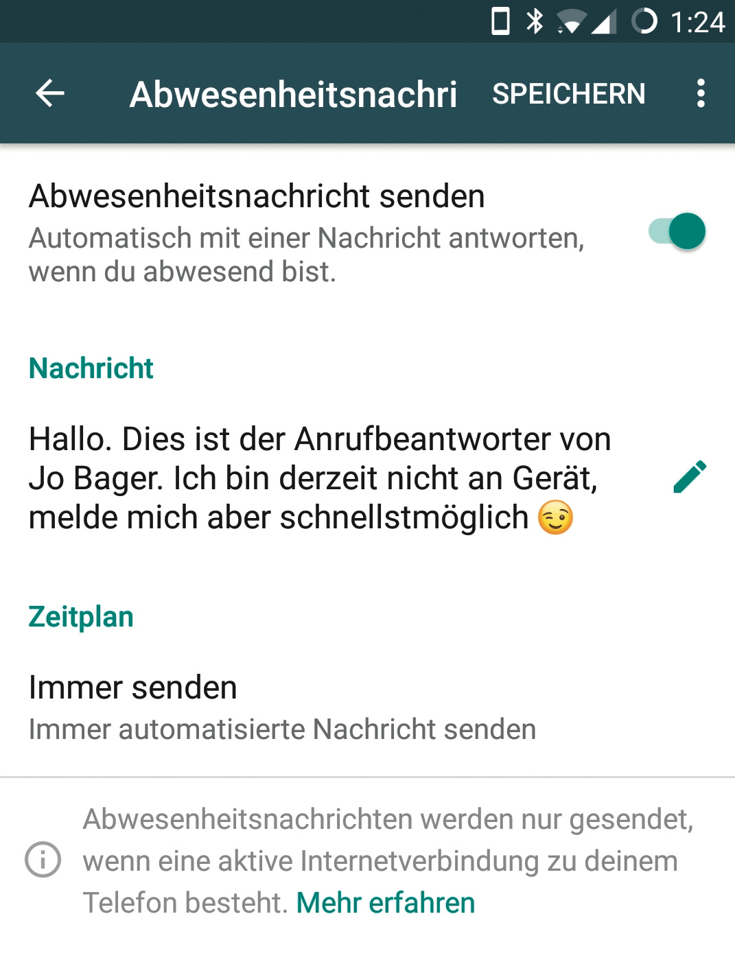 ¯!!! WhatsApp Business ist eine minimal erweiterte, ebenfalls kostenlose Version von WhatsApp, die sich an kleine Unternehmen und Selbstständige richtet. Diese können sich auf einer Profilseite präsentieren, unter anderem mit Standort und Öffnungszeiten. Mit Labels, automatischen Begrüßungs- und Abwesenheits-Meldungen sowie Broadcasts an bis zu 256 Empfänger sollen Firmen einfacher mit ihren Kunden kommunizieren können.