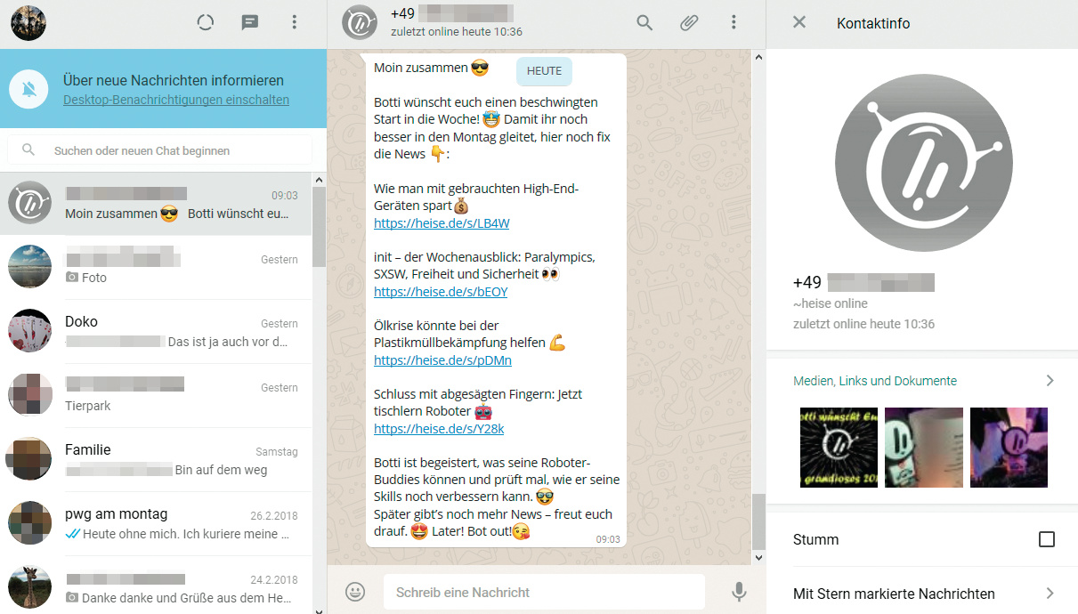 ¯!!! Es gibt eine Reihe von anderen verschlüsselnden Messengern, zum Beispiel Telegram, Signal und Threema. Jede der Apps bietet Funktionen oder Merkmale, die WhatsApp nicht hat. Der Quellcode von Signal etwa ist als Open Source verfügbar. Damit können Dritte ihn kontrollieren. Beim Schweizer Unternehmen Threema gehen die verschlüsselten Nachrichten sowie Metadaten über Schweizer Server und nicht wie bei WhatsApp über US-amerikanische und sind somit nicht in der Reichweite der US-Behörden. Threema lässt sich zudem komplett anonym nutzen. Für alle drei Messenger-Alternativen – und viele weitere – gilt allerdings: Ihre Benutzerbasis ist wesentlich kleiner als die von WhatsApp. Und damit ist die Wahrscheinlichkeit kleiner, dort ähnlich viele Freunde und Bekannte zu erreichen wie bei WhatsApp. (jo@ct.de)