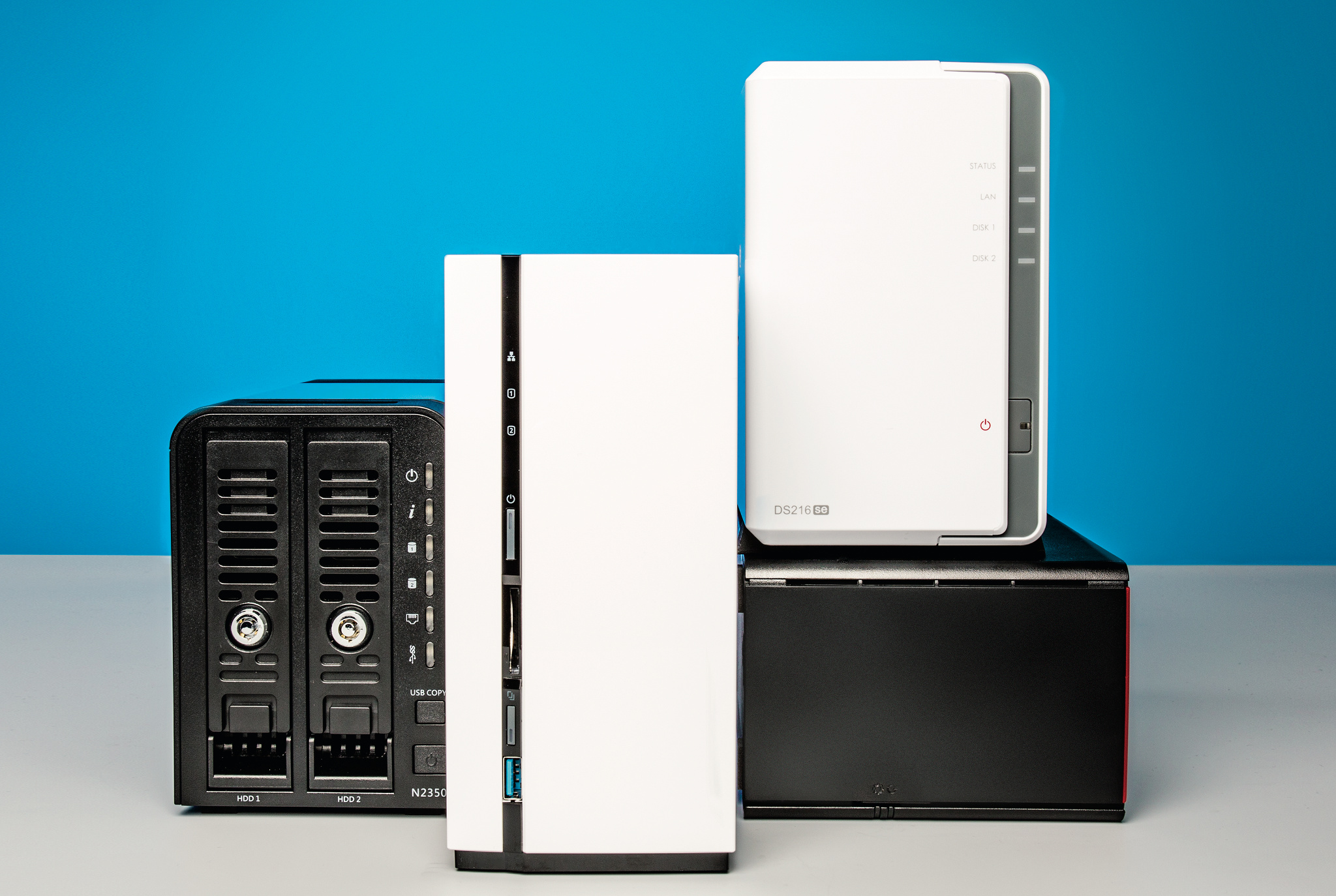 Wir haben uns das brandneue Thecus N2350 und die älteren Modelle QNAP TS-228, Synology DS216se und Buffalo LS520D angesehen. Sie sind ohne Festplatten für rund 90 bis 150 Euro zu erstehen.
