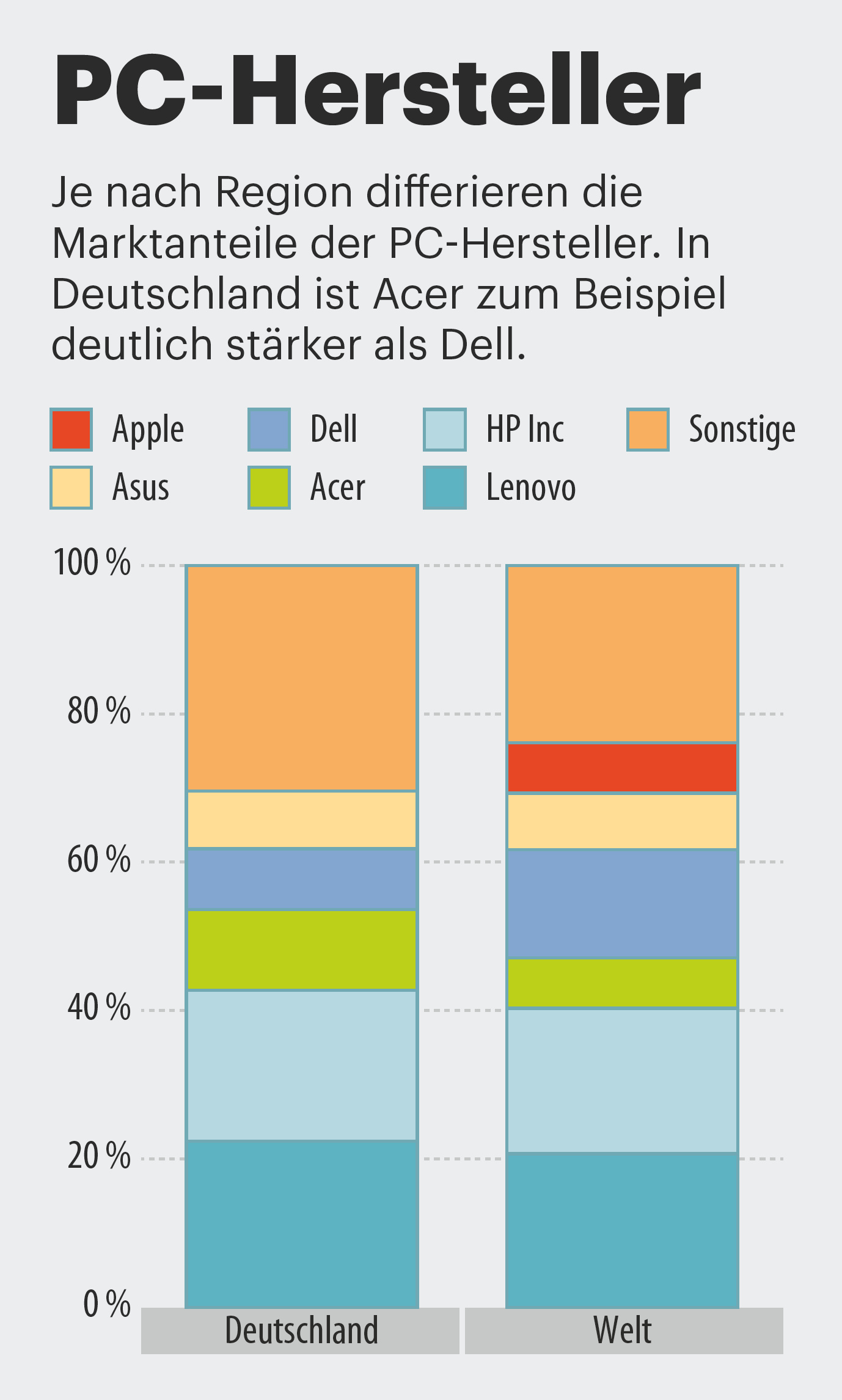 Rund 60 Prozent der derzeit verkauften Rechner sind Notebooks. Das Verhältnis zwischen stationären und mobilen Geräten war in den letzten Jahren einigen Schwankungen unterworfen. Der Absatz von Desktop-PCs fluktuierte weit weniger, weil es sich dabei größtenteils um Business-Geräte handelt. Diese werden von Firmen für einen festgelegten Zeitraum von drei bis fünf Jahren gekauft oder geleast, steuerlich abgeschrieben und danach kontinuierlich ersetzt.