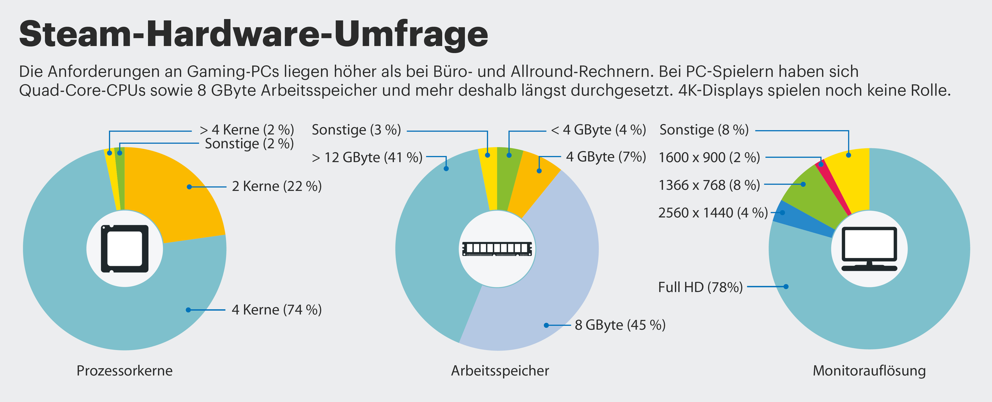 Die monatlich veröffentlichte Hardware-Umfrage der Gaming-Plattform Steam hilft Spiele-Entwicklern, die Hardware-Ausstattung einzuschätzen und ihre Titel daran anzupassen. Da hier alle aktuell für 3D-Spiele genutzten Rechner mitzählen, also auch der vor drei Jahren angeschaffte Gaming-PC, spiegeln sich langfristige Trends besser wider als in aktuellen Verkaufszahlen.