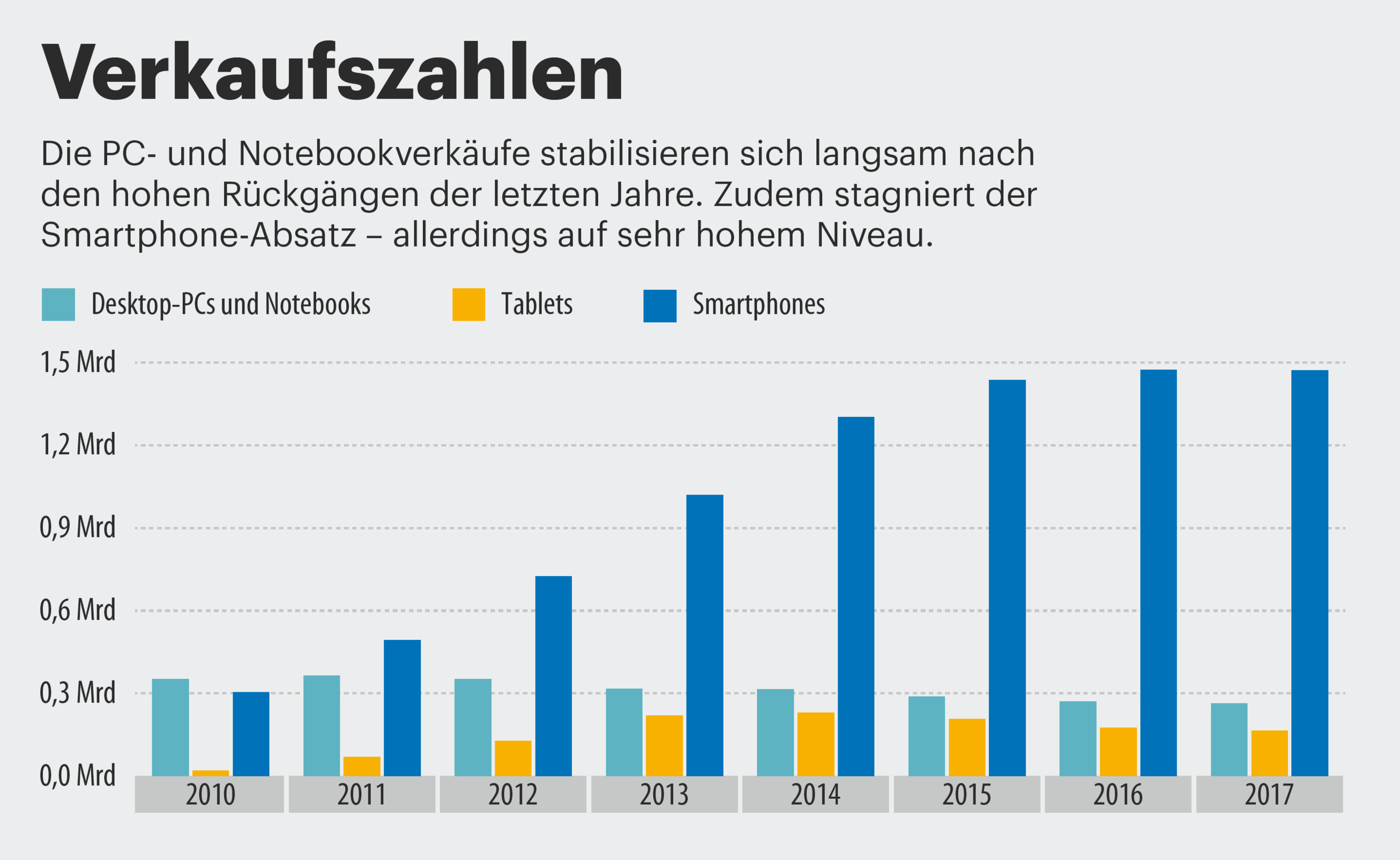 Oft heißt es nach der Vorstellung aktueller Verkaufszahlen, der PC sei tot. Zwar gingen laut den Marktforschern von Gartner 2017 rund zwei Prozent weniger Rechner über die Ladentheken als im Jahr zuvor, der Rückgang ist aber weit weniger dramatisch als in den Vorjahren. Angesicht von weltweit 263 Millionen verkauften Desktop-Rechnern und Notebooks bleibt der PC-Markt weiterhin ein Multimilliardengeschäft.