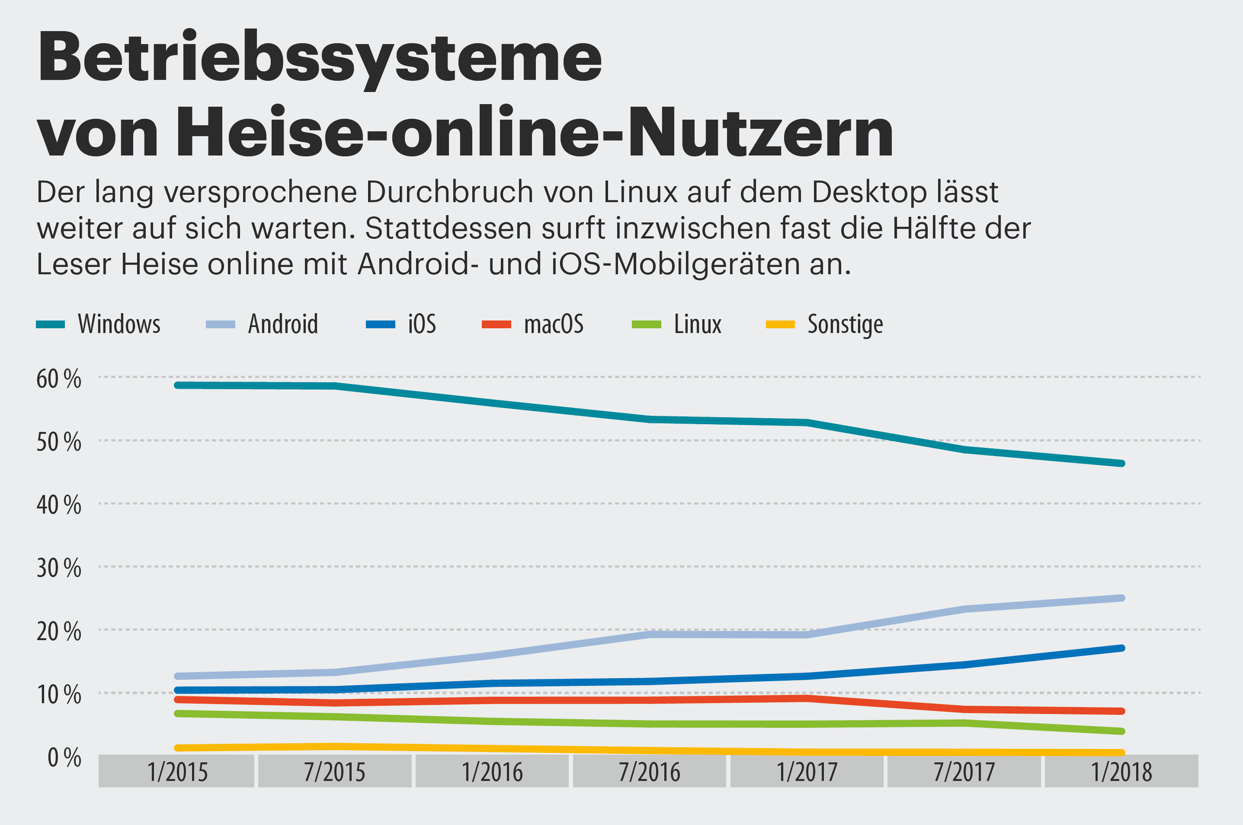 Firefox kommt zumeist unter Windows 7 (44 Prozent) zum Einsatz, wobei Windows 10 mit 36 Prozent aufholt. Der Linux-Anteil liegt mit 2,7 Prozent tiefer, als er tatsächlich ist, weil in die Statistik nur Firefox-Nutzer von Ubuntu und Mozilla-Binärdateien einfließen.