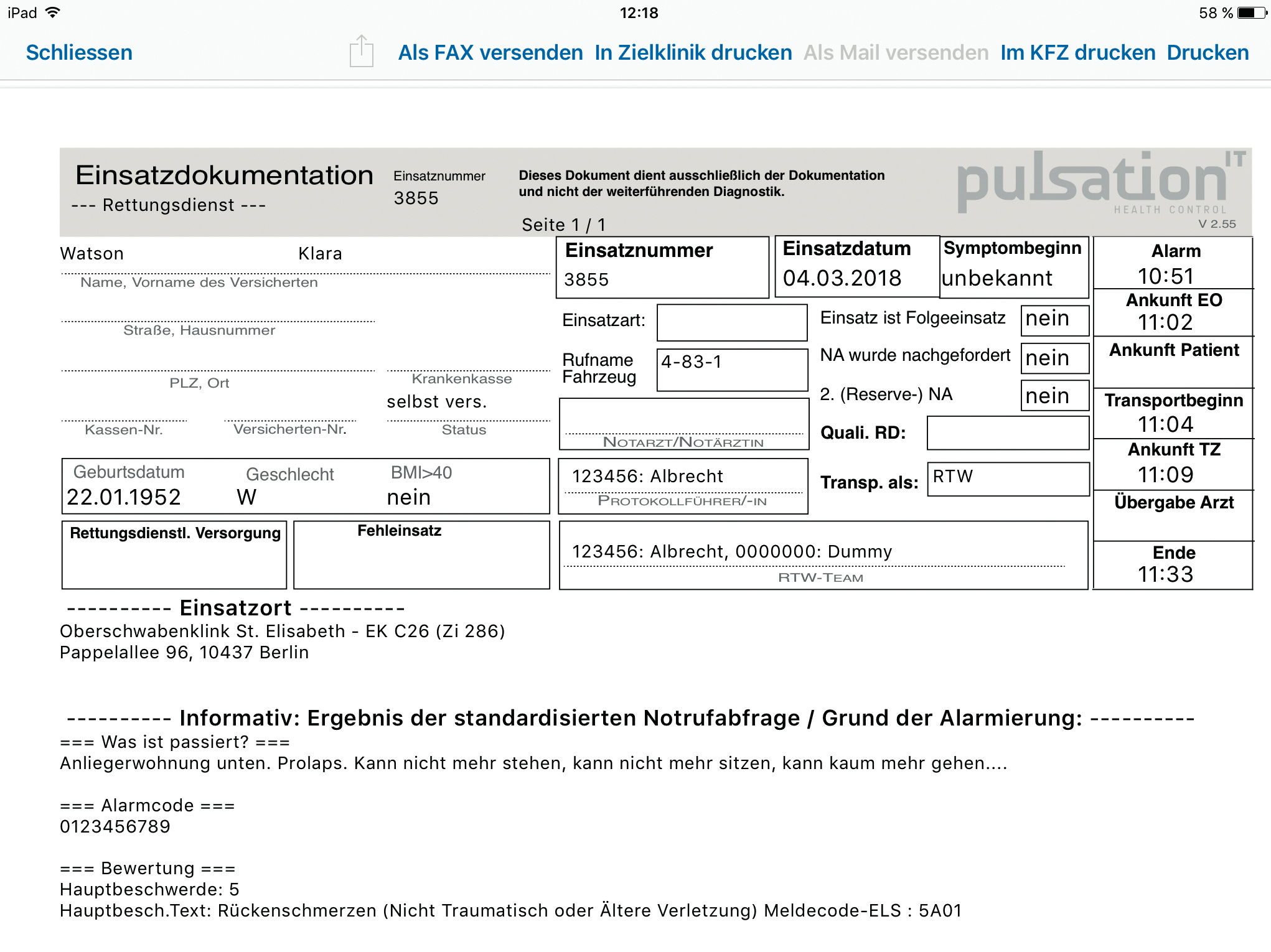 Die Server lieferten nach der Authentifizierung mit den bekannten Zugangsdaten bereitwillig echte Informationen über Rettungsdienstfahrzeuge, Mitarbeiter sowie laufende Einsätze inklusive Einsatzort und Notfallmeldung. Abrufen konnten wir sogar detaillierte Patientendaten wie Name, Adresse, Geburtsdatum, Details zur Krankenkasse und zum Teil die Zielklinik. Für den Datenabgriff war nicht mal die App nötig: Wer die Adresse des Backends und die Zugangsdaten kannte, konnte die sensiblen Informationen auch einfach mit dem Browser abrufen. Namen und Adressen der Patienten waren zwar teilweise gesondert verschlüsselt – die Daten ließen sich jedoch innerhalb der NaProt-App im Klartext anzeigen, schließlich lagen sämtliche zur Nutzung der App nötigen Informationen vor. Weiterhin wurden die Daten häufig zusätzlich auch unverschlüsselt übertragen. Wer böse Absichten verfolgt, hätte sogar dafür sorgen können, dass das iPad des wirklichen Rettungsmittels den Einsatz nicht mehr über NaProt erhalten hätte. Auch die Erfassung falscher Daten wäre durch das Sicherheitsleck möglich gewesen – schließlich konnte man sich als legitimer Mitarbeiter mit allen Rechten am System anmelden. Die Integrität aller bisher im System verarbeiteten Einsatzprotokolle ist hierdurch nicht mehr gewährleistet. Da im Rettungseinsatz mehrere unterschiedliche Systeme parallel laufen, hätte ein Angreifer jedoch nicht den Einsatz komplett verhindern können Dies zumindest ist beruhigend.