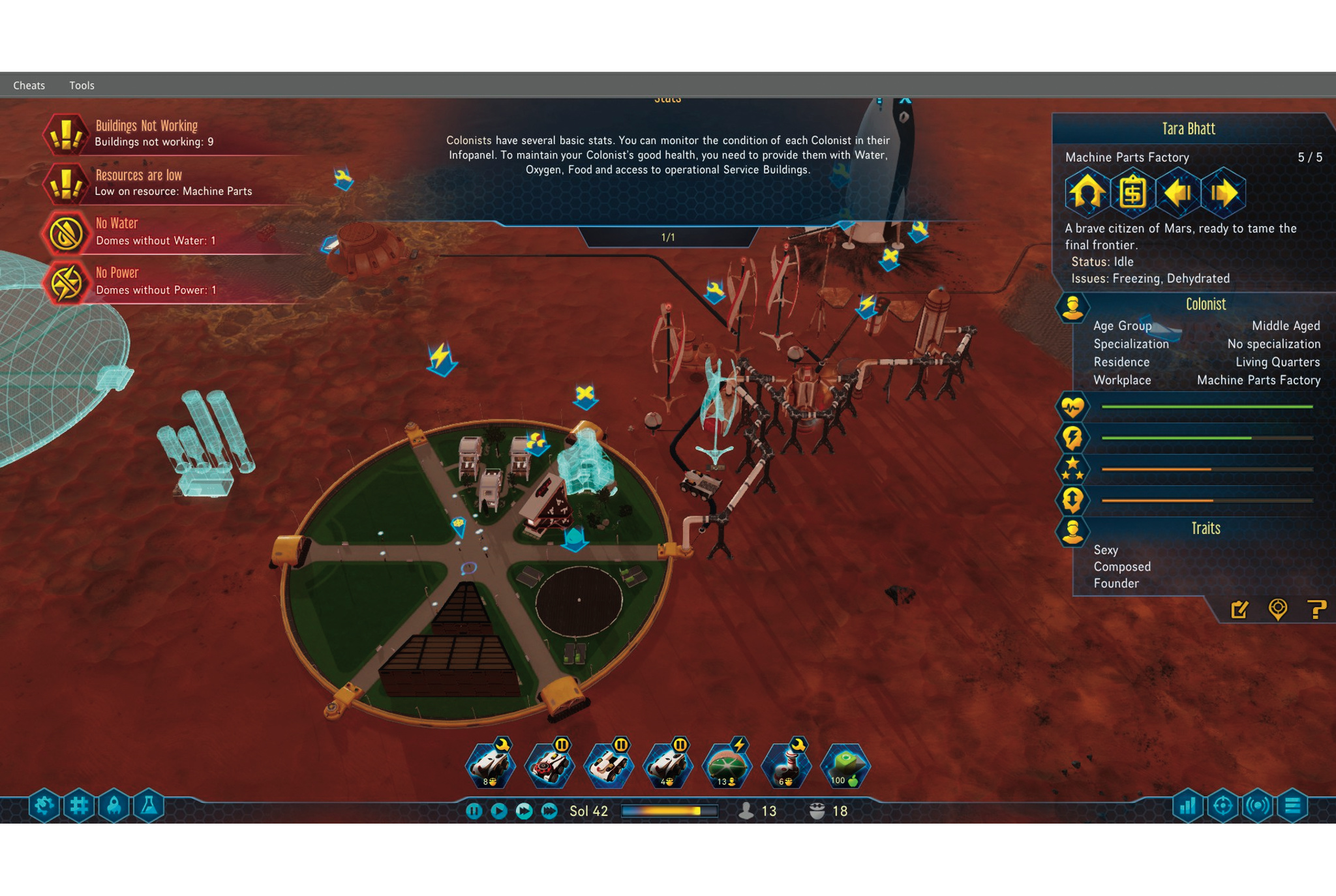 Leider endet die detailreiche Eroberung schnell in Micromanagement – und dem Tod der tapferen Siedler. In Schrägdraufsicht wählt man zunächst einen Landeplatz für die erste der wiederverwendbaren Raketen aus. Zentral zum Überleben auf dem Mars sind die Drohnen, die praktisch alle Arbeiten erledigen. Jede Rakete befehligt eine gewisse Anzahl von ihnen, die im vorgegebenen Bereich automatisch Waren verschieben und Wartungsarbeiten verrichten. Elf Ressourcen müssen erwirtschaftet werden. Beton und Metall werden zum Bau der Biosphären gebraucht. Diese lassen sich leicht abbauen, da sie sich an der Oberfläche befinden. Edelmetalle oder Wasser müssen in eigens errichteten Minen abgebaut, Polymere und Maschinenteile in Fabriken hergestellt werden. Strom erhält man durch Solarzellen, Windräder oder teure Generatoren. An den elektrischen Verbindungskabeln lassen sich auch die drei Rover aufladen, mit denen man die große Karte nach Bodenschätzen absuchen kann.