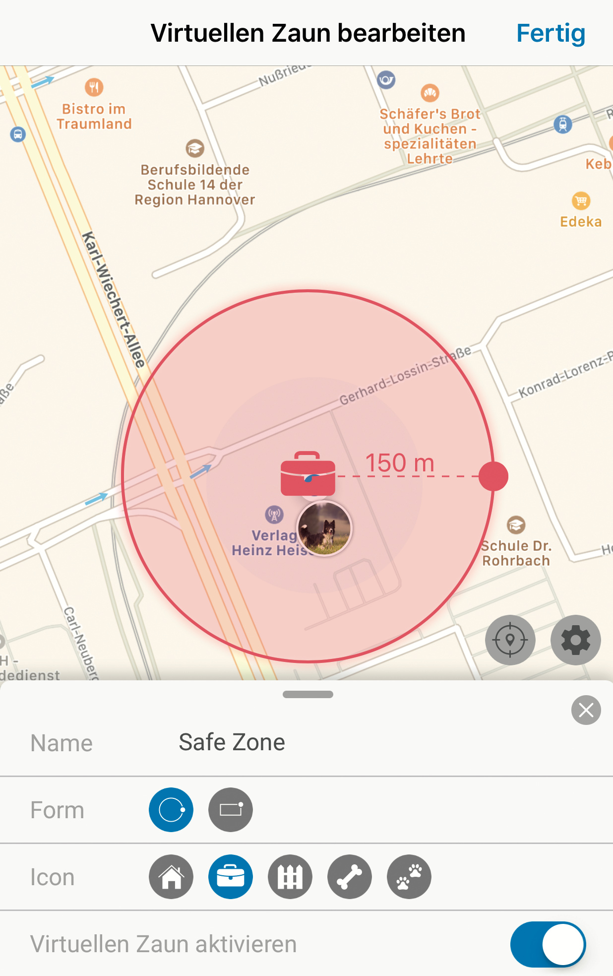 Einen guten Kompromiss erzielen Sie, wenn Sie den Bereich so groß wählen, dass sich der Tracker auch dann noch im Geofence-Bereich befindet, falls der Empfang des GPS-Signals scheitert und der Tracker eine grob angenäherte Position nur auf Basis der Zellortung über das Mobilfunknetz findet. (mil@ct.de)