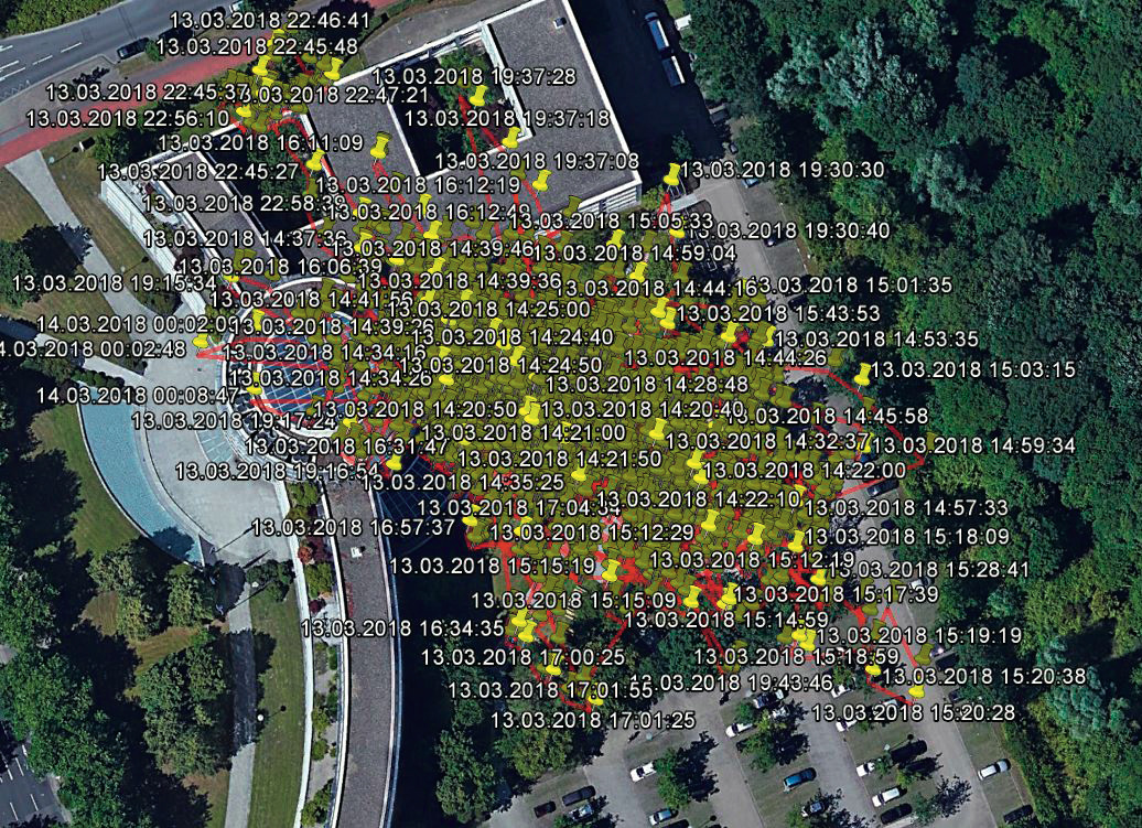 ¯!!! Fehlerursache Nummer eins bei Geofences sind zu klein gewählte Bereiche. Selbst bei guter Sicht auf den Himmel und damit gutem GPS-Empfang scheint die Position des Trackers über einen längeren Zeitraum stark zu wandern (siehe Bild). Damit der Tracker nicht zu oft anschlägt, senden die meisten Modelle Geofence-Alarme erst, wenn sie den Tracker über einen bestimmten Zeitraum außerhalb des definierten Bereiches lokalisieren. Falls es trotzdem zu oft Fehlalarme gibt, sollten Sie den Geozaun großzügiger bemessen.
