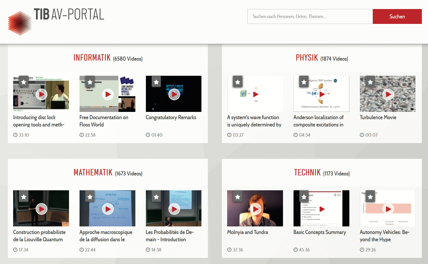 Die Technische Informationsbibliothek der Leibniz Universität Hannover, kurz: TIB, hat nicht nur Gedrucktes im Angebot, sondern unterhält auch ein Portal für audiovisuelle Medien. Hier gibt es Filme zu den Kernthemen der Bibliothek, das sind Technik und Architektur, Chemie und Physik, Mathematik und Informatik. Die Videos zeigen Visualisierungen, Simulationen und Experimente, aber auch Interviews, Vorlesungs- und Konferenzaufzeichnungen. In Kooperation mit dem Hasso-Plattner-Institut für Softwaresystemtechnik wurde das TIB AV-Portal ab dem Sommer 2011 entwickelt; seit Frühjahr 2014 ist es online. Ende 2012 wurde der Medienbestand der ehemaligen „IWF Wissen und Medien“ aus Göttingen auf die TIB übertragen. Ein großer Teil der IWF-Filme ist daher ebenfalls über das Portal abrufbar.