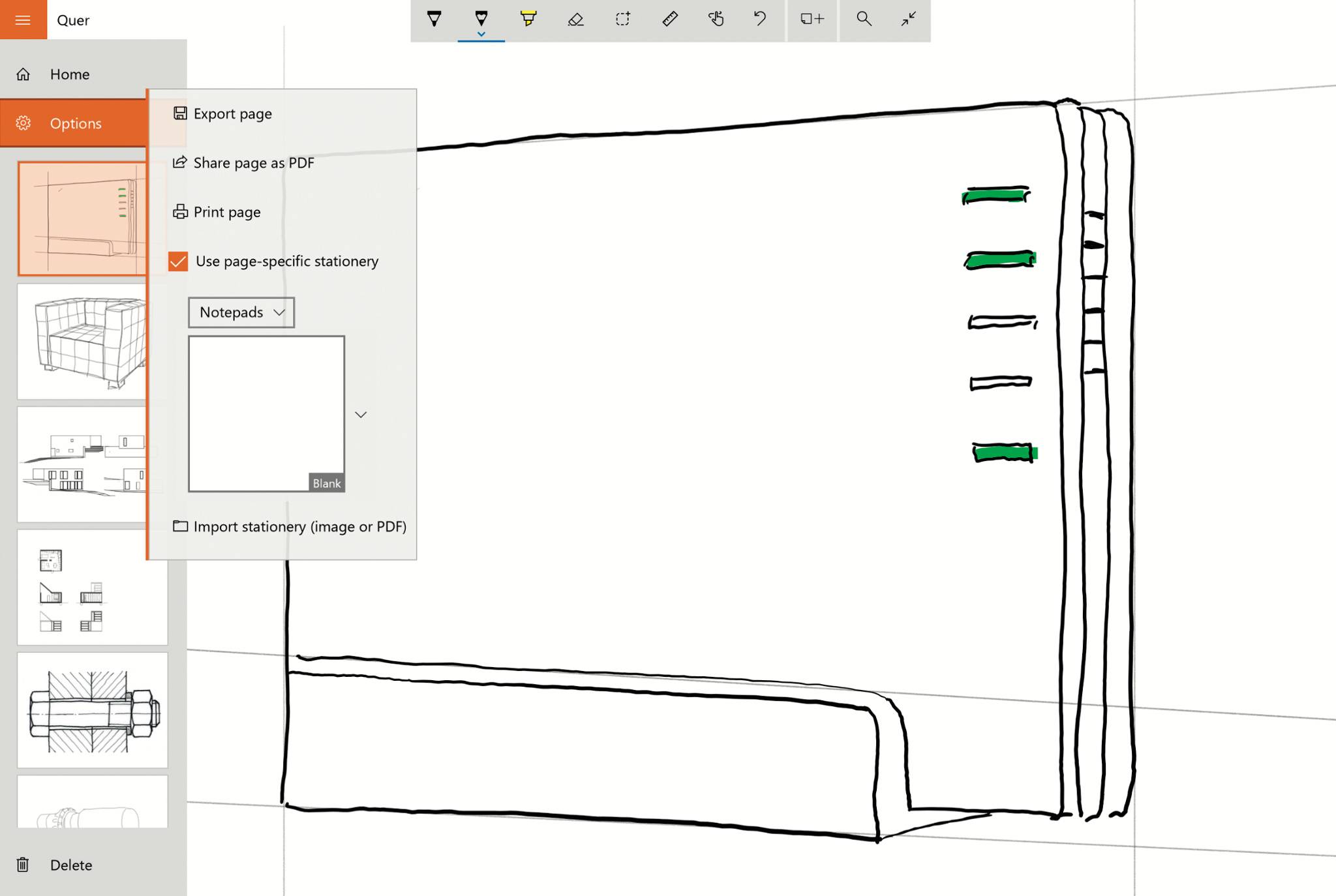 Penbook ist ein einfacher virtueller Skizzenblock für Windows 10. Je nachdem, ob der Anwender ein Notizbuch im Hoch- oder Querformat anlegt, präsentiert ihm Penbook dafür unterschiedliche Vorlagen – von liniertem Papier bis zu Wochenplanern, darunter auch ein Notenblatt oder Zeichenhilfen für perspektivische oder isometrische Zeichnungen.
